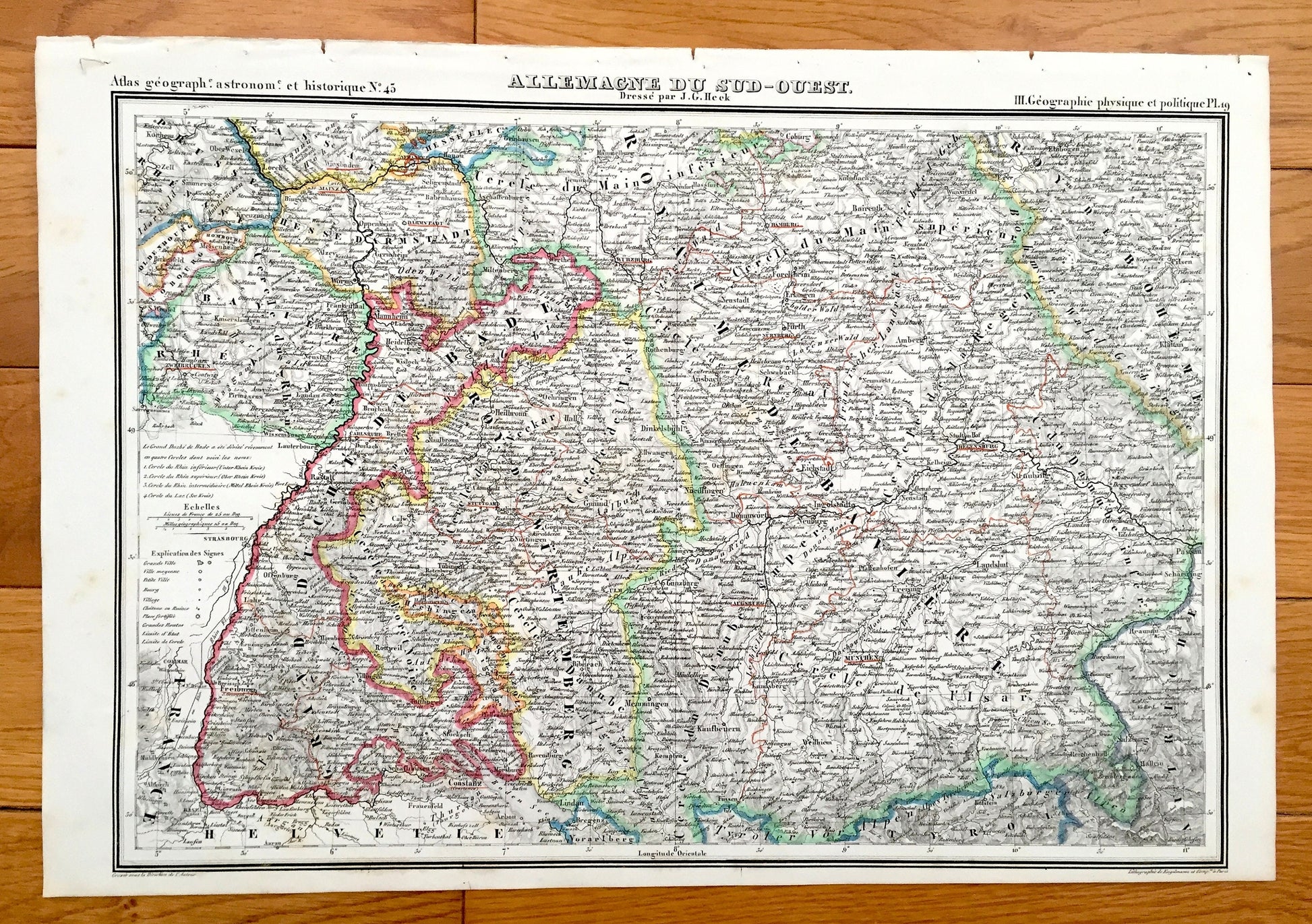 See what South-West Germany—or Allemagne du Sud-Ouest—looked like during the early nineteenth century. Lots of charming, intricate details and contours, including mountains, islands, counties, rivers and tribal areas. Hand colored. Verso is blank.