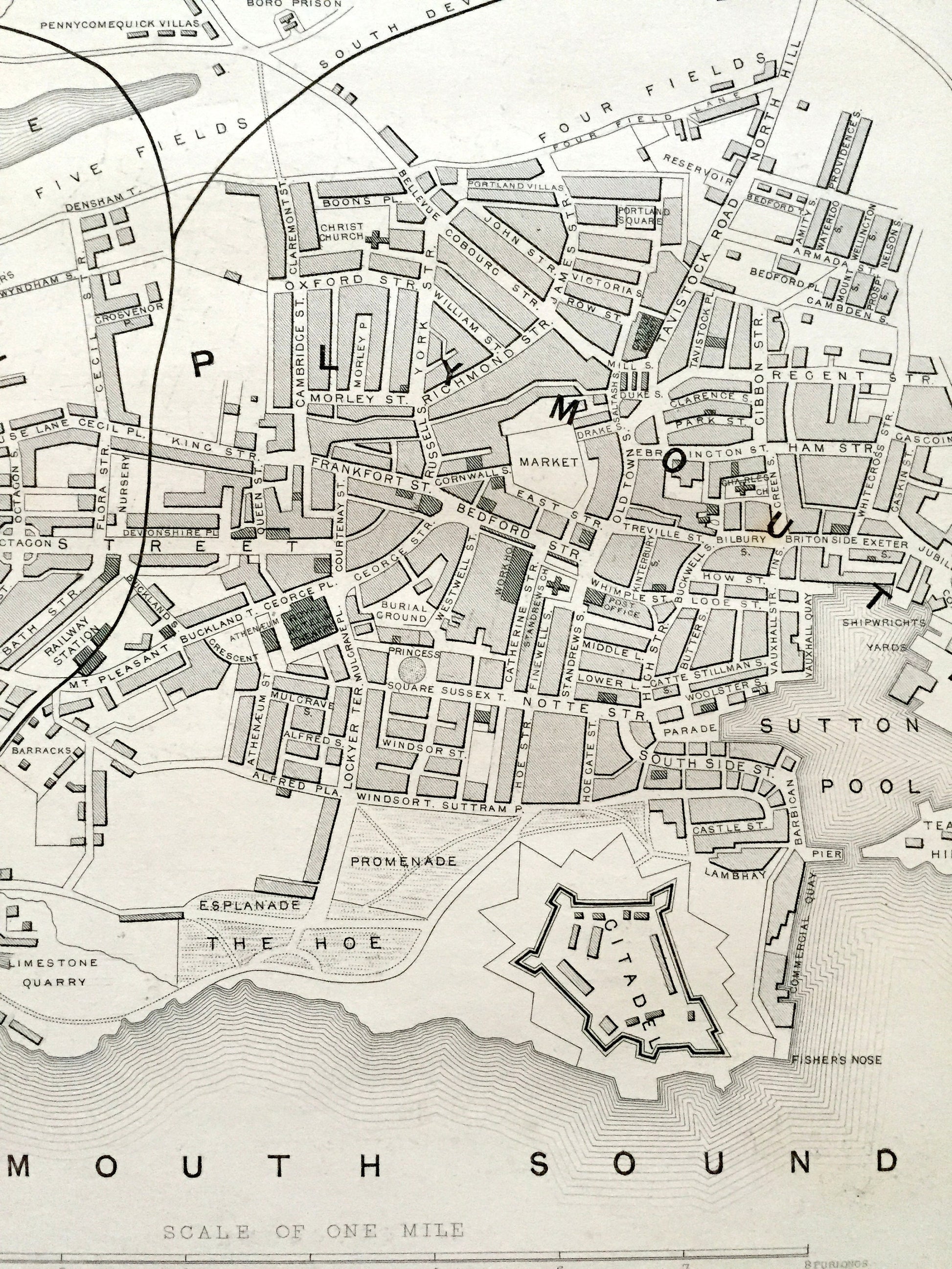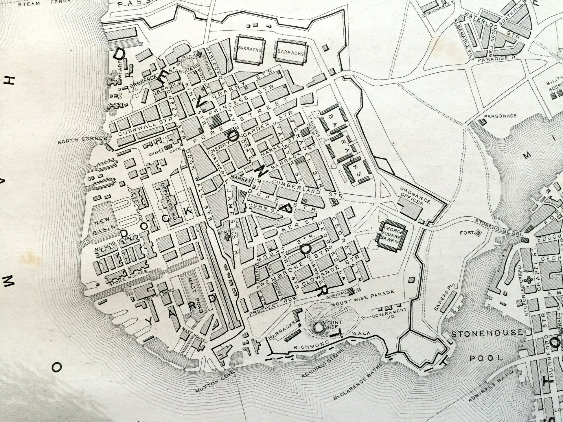 See what Plymouth looked like over 170 years ago. Lots of charming, intricate details and geological contours, including streets, parks, bridges, rivers, churches, castles and other landmarks and points of interest. Verso is blank.
