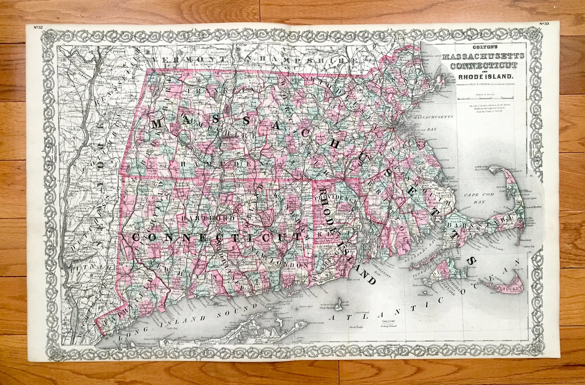 Antique 1855 New England County Map by Coltons – Massachusetts, Connecticut, Rhode Island, Cape Cod, Martha's Vineyard, Boston Berkshires MA