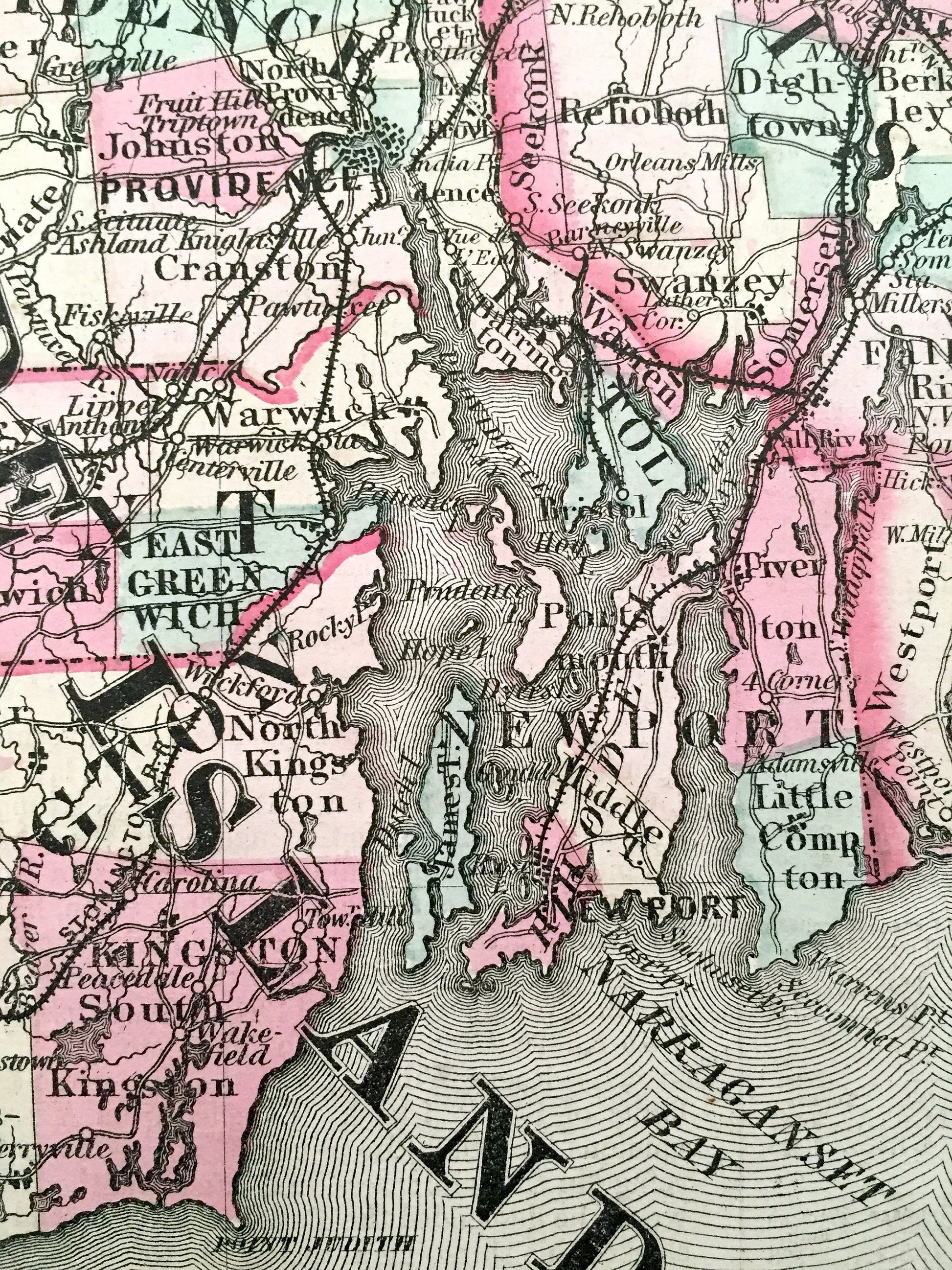 See what Massachusetts, Connecticut and Rhode Island looked like over 160 years ago. Lots of charming, intricate details, decorative border and geological contours, including mountains, islands, counties, railroads and rivers. Hand colored. Verso is information on the states of Rhode Island and Massachusetts.