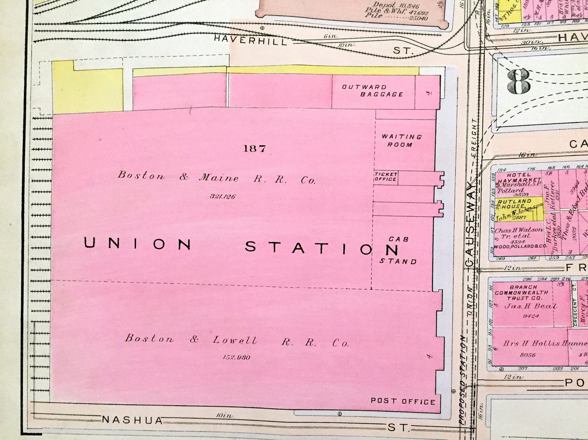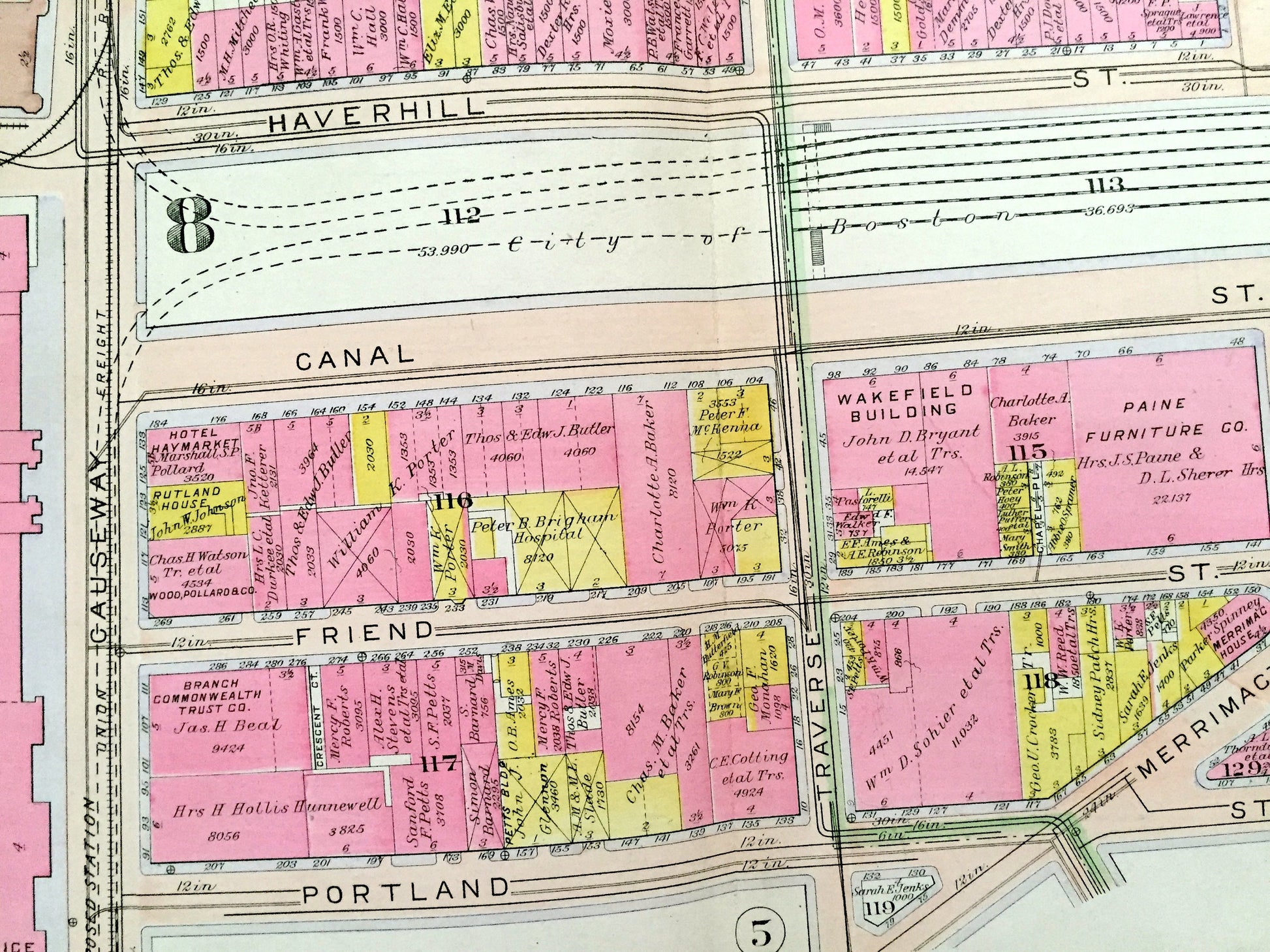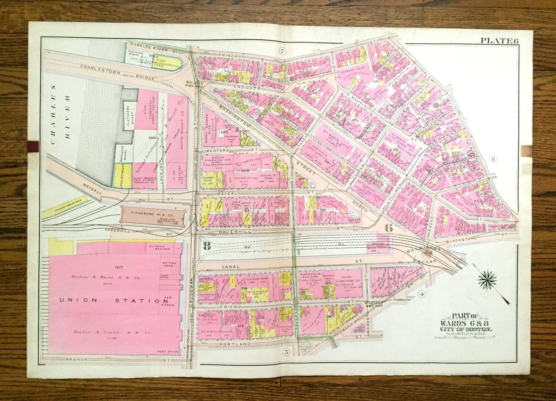 Beautiful, antique map of the North End, West End and Bullfinch Triangle Historic District Neighborhoods of Boston, Massachusetts, including the future site of North Station and Boston Garden. This is an authentic map (Plate #6) taken from G.W. Bromley's "Atlas of the City of Boston, Boston Proper and Back Bay" published in 1908 and is NOT a computer reproduction.