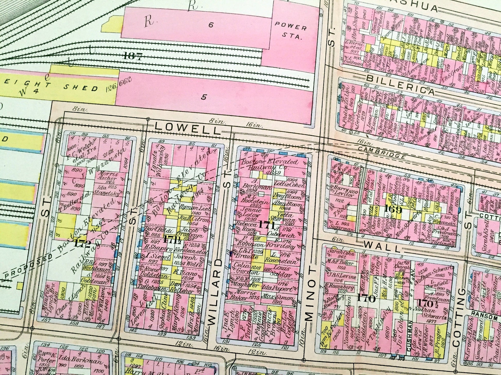 Cities, Neighborhoods & Points of Interest: Boston, Charles River, West End, Charlesbank, Bullfinch Triangle Historic District, future site of Massachusetts General Hospital and many other modern buildings, North Station, Thomas P. O'Neill Jr Federal Building, Lederman Park, Valenti Square, and many other streets, houses, churches, schools, wharves and land property owners' names.