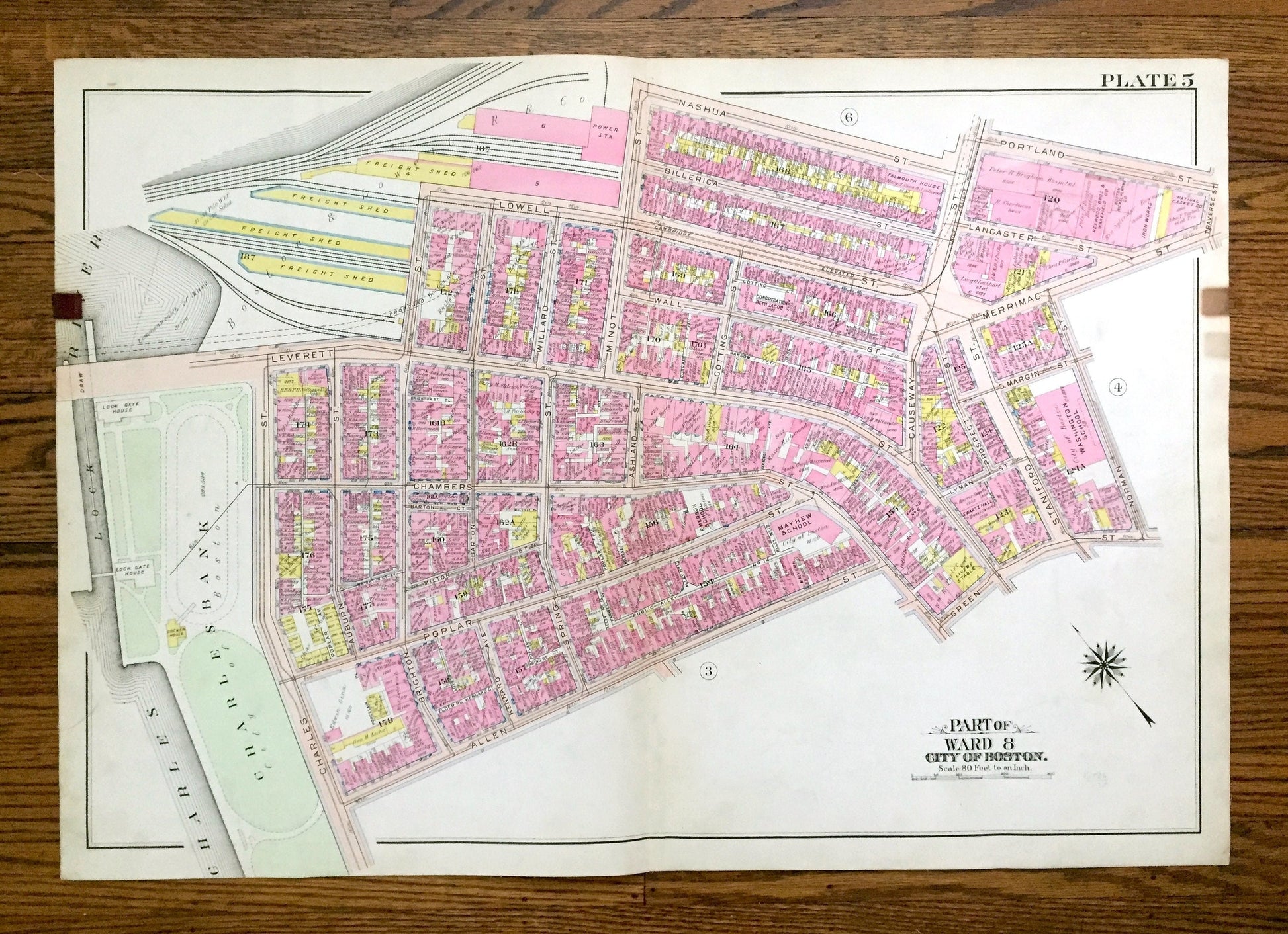 Beautiful, antique map of the West End and Bullfinch Triangle Neighborhoods of Boston, Massachusetts, including much of what would become the Mass General Campus. This is an authentic map (Plate #5) taken from G.W. Bromley's "Atlas of the City of Boston, Boston Proper and Back Bay" published in 1908 and is NOT a computer reproduction.