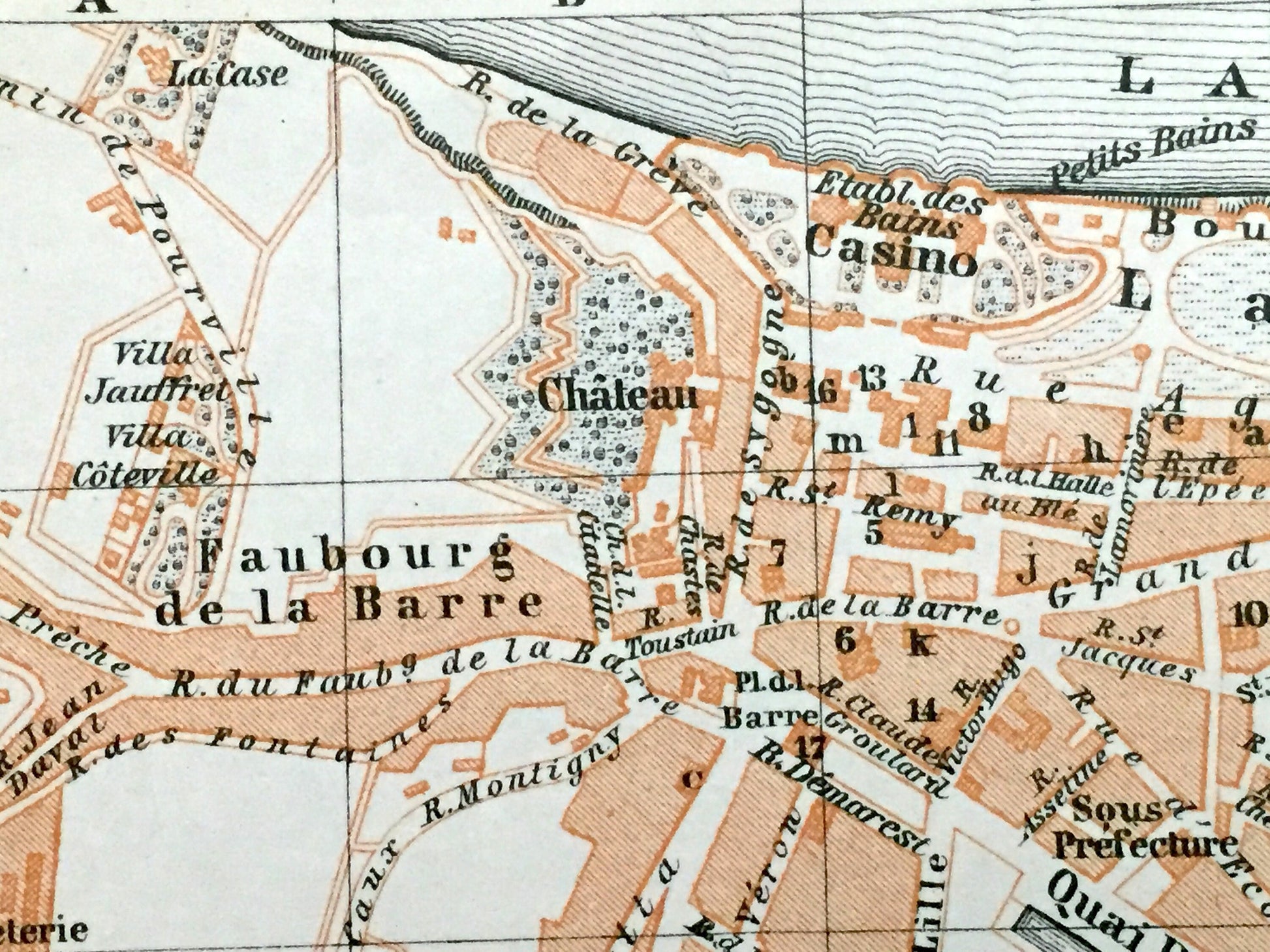 Antique 1909 Dieppe, France Map from Baedekers Guide Atlas – Normandy, beach, fishing port, WWII, Chateau de Dieppe, Gothic cathedral