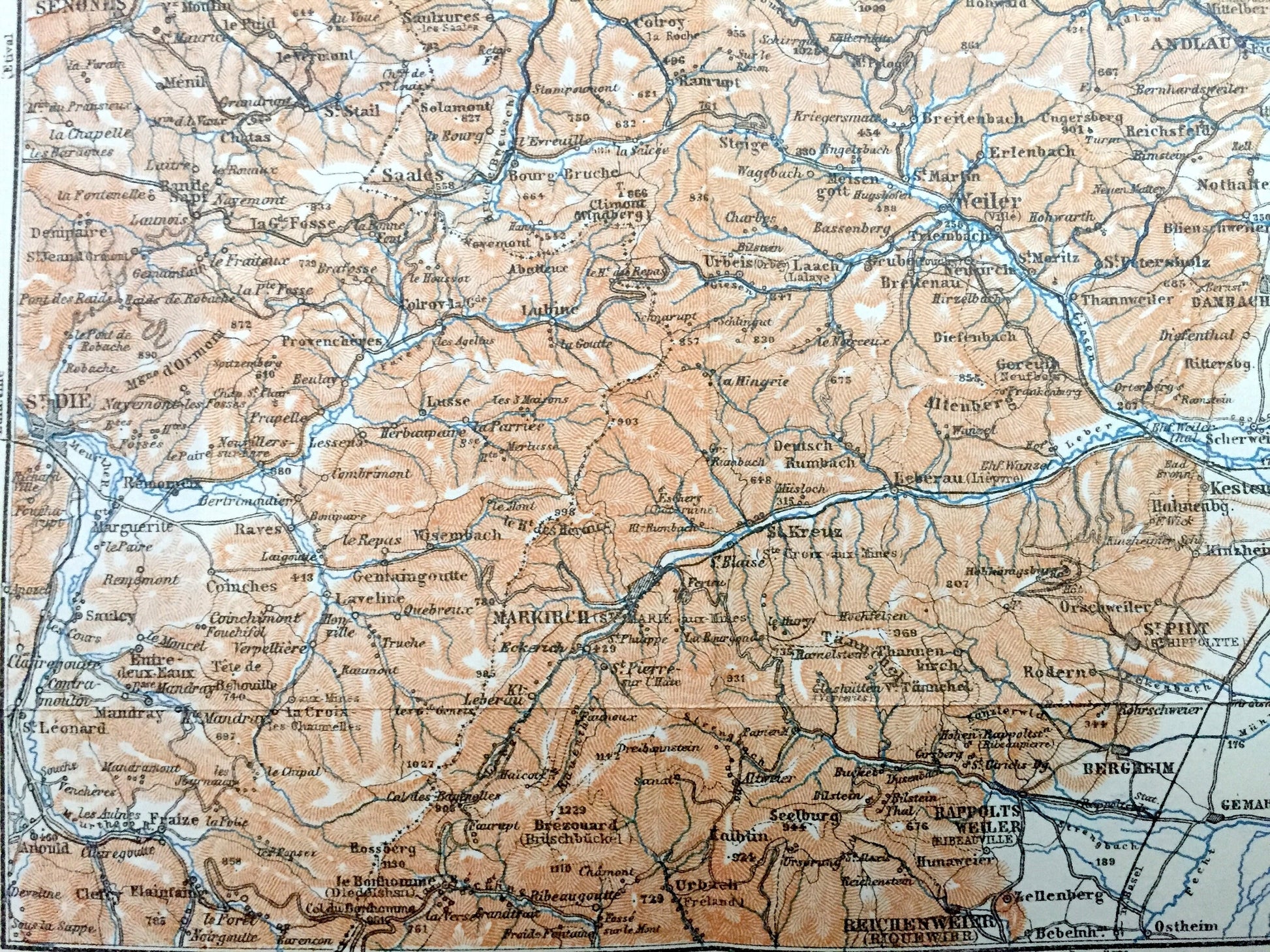 Antique 1909 Eastern France & Austria Map from Baedekers Guide Atlas – St. Die, Weiler, Andlau, Molsheim, Rosheim, Barr, Schlettstadt