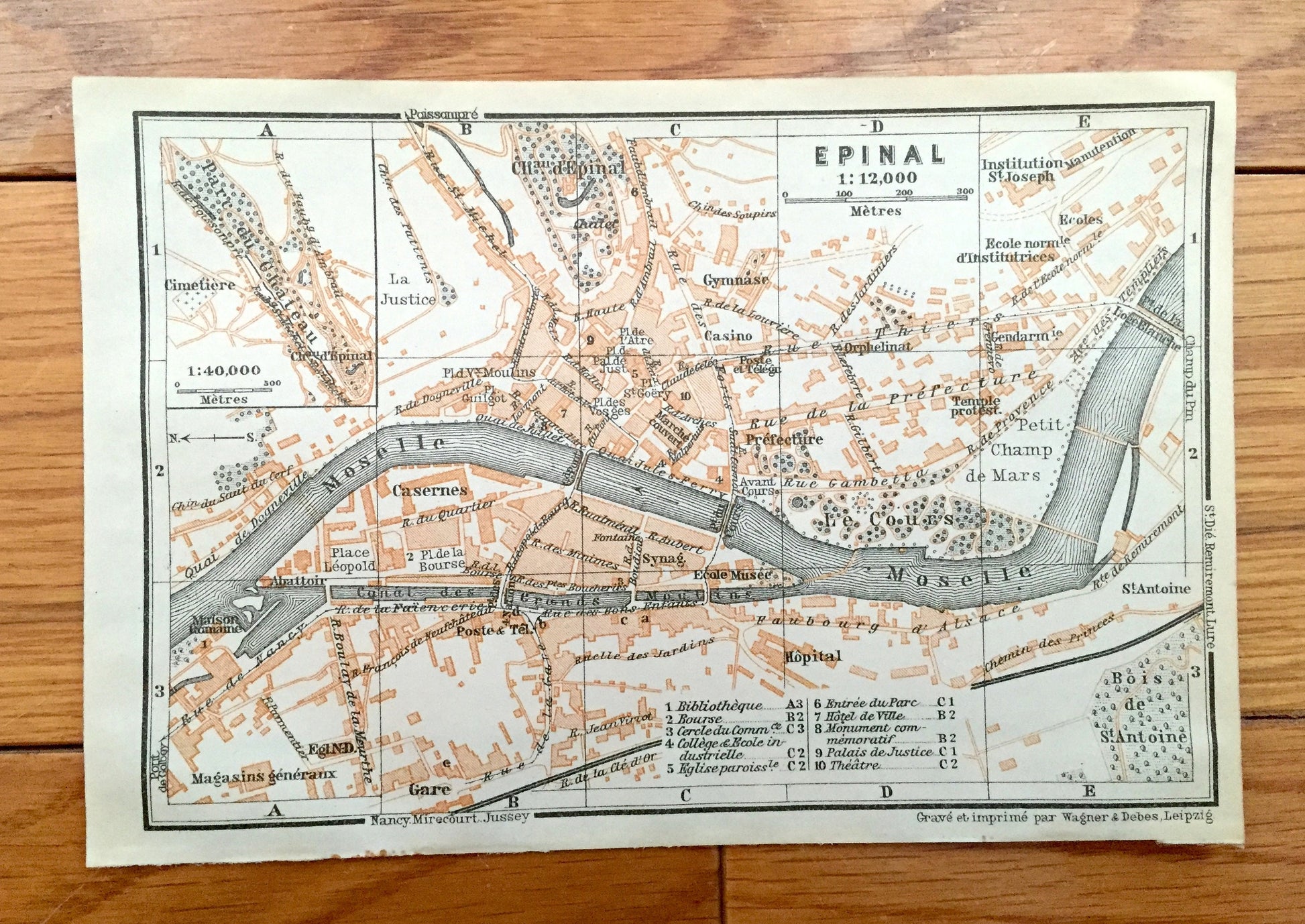 Beautiful, antique map of Epinal, France. This is an authentic print from "Baedeker's Handbook for Travelers: Northern France, from Belgium and the English Channel to the Loire," published in 1909 and NOT a computer reproduction.
