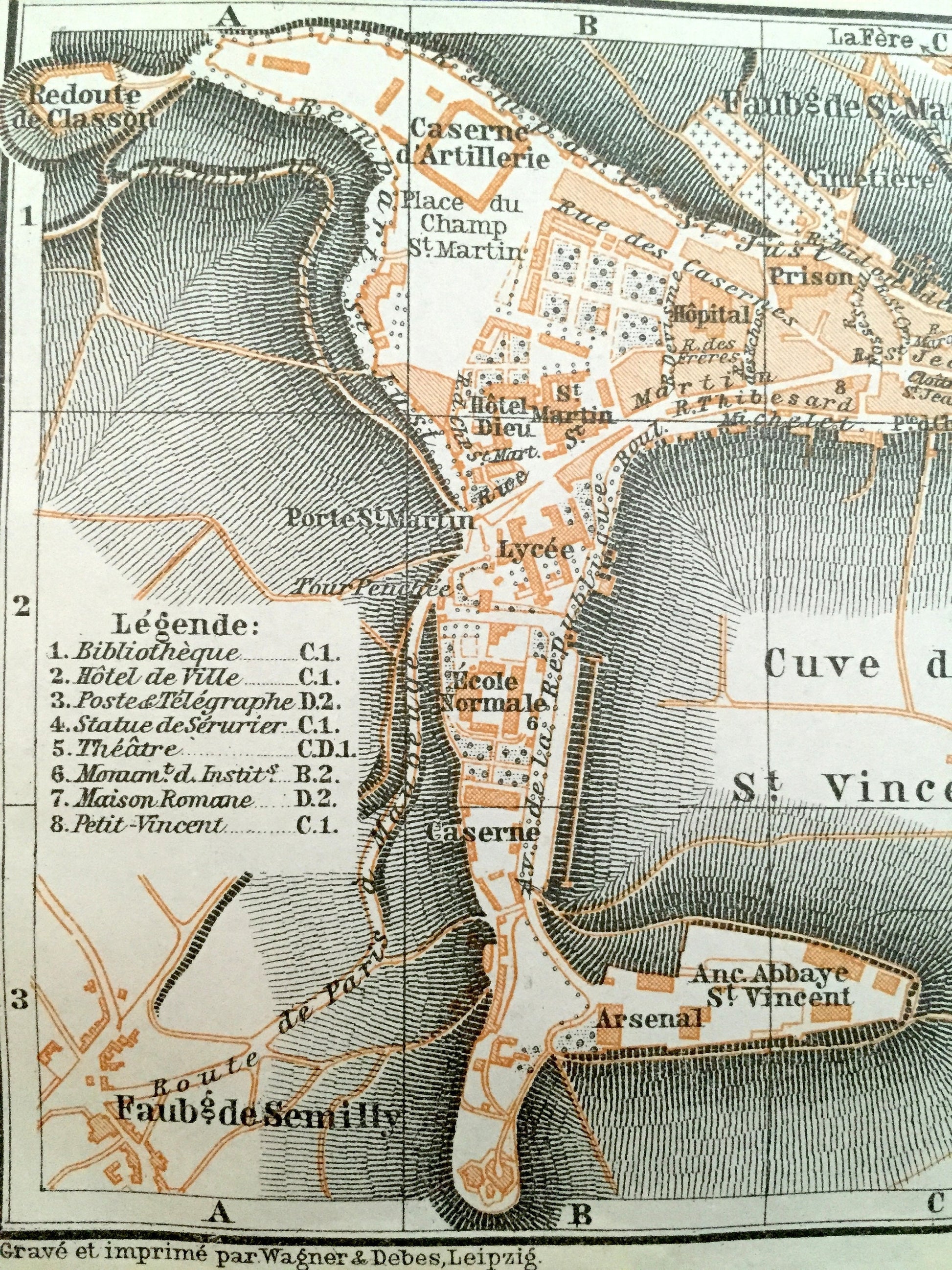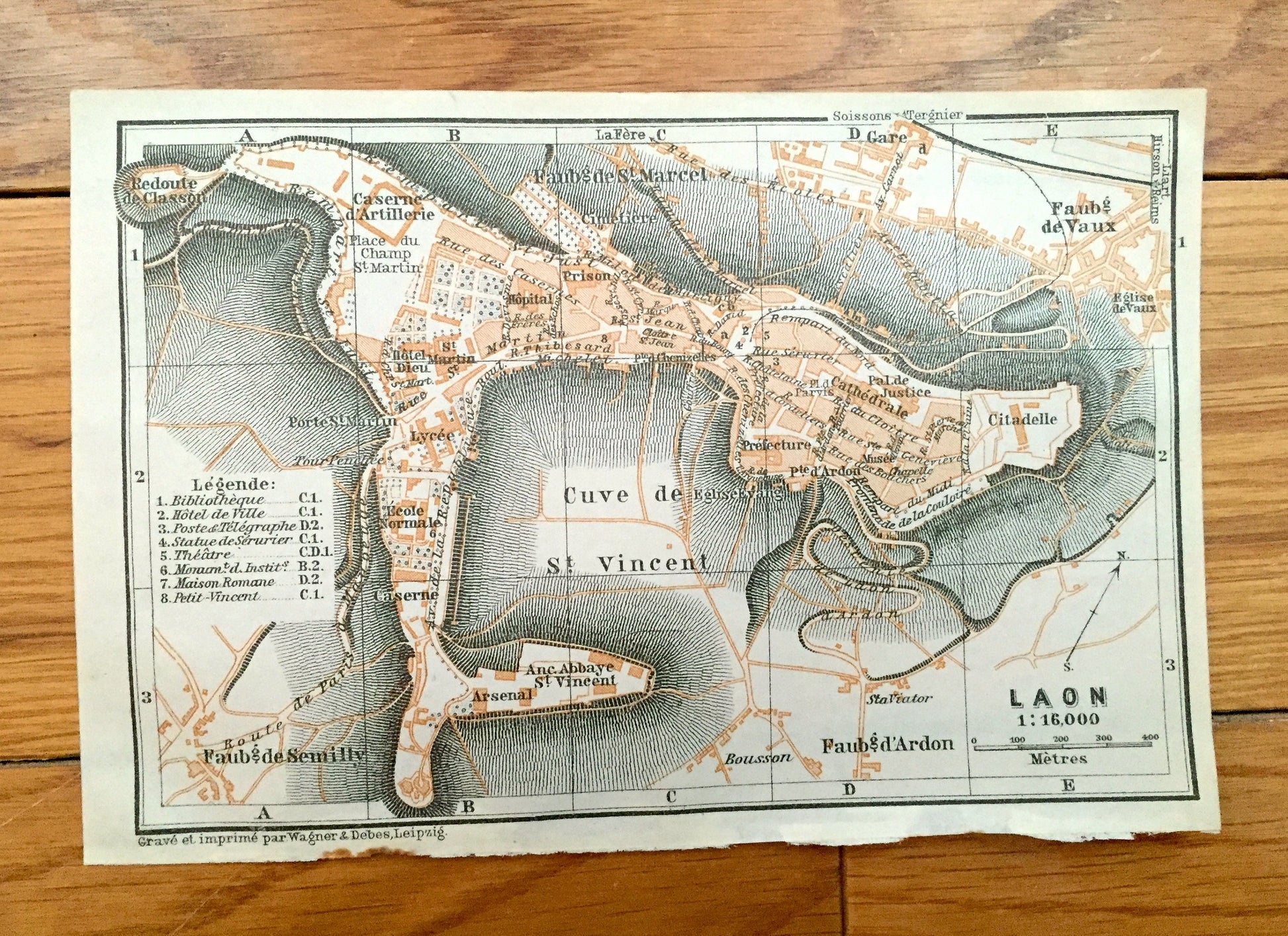 Beautiful, antique map of Laon, France. This is an authentic print from "Baedeker's Handbook for Travelers: Northern France, from Belgium and the English Channel to the Loire," published in 1909 and NOT a computer reproduction.