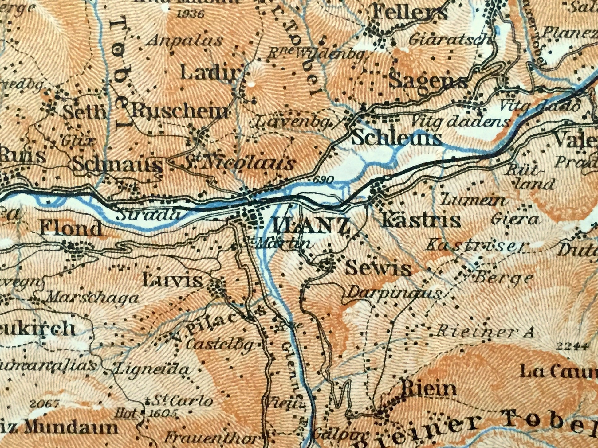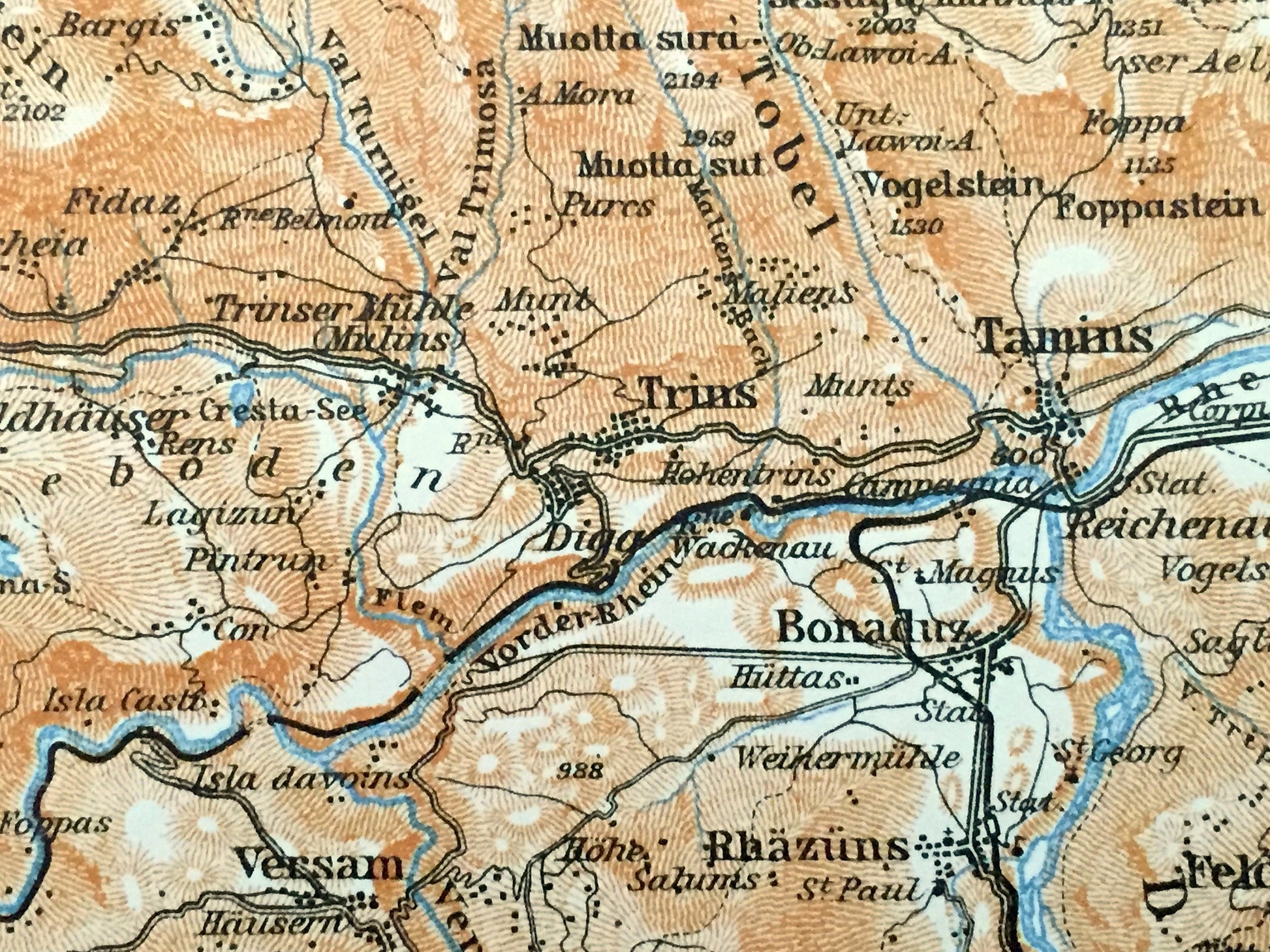 Antique 1913 Ilanz, Switzerland Map from Baedekers Guide Atlas – Tamins, Elm, Flond, Schleuis, Bonaduz, Brigels, Panix, Andest, Fellers