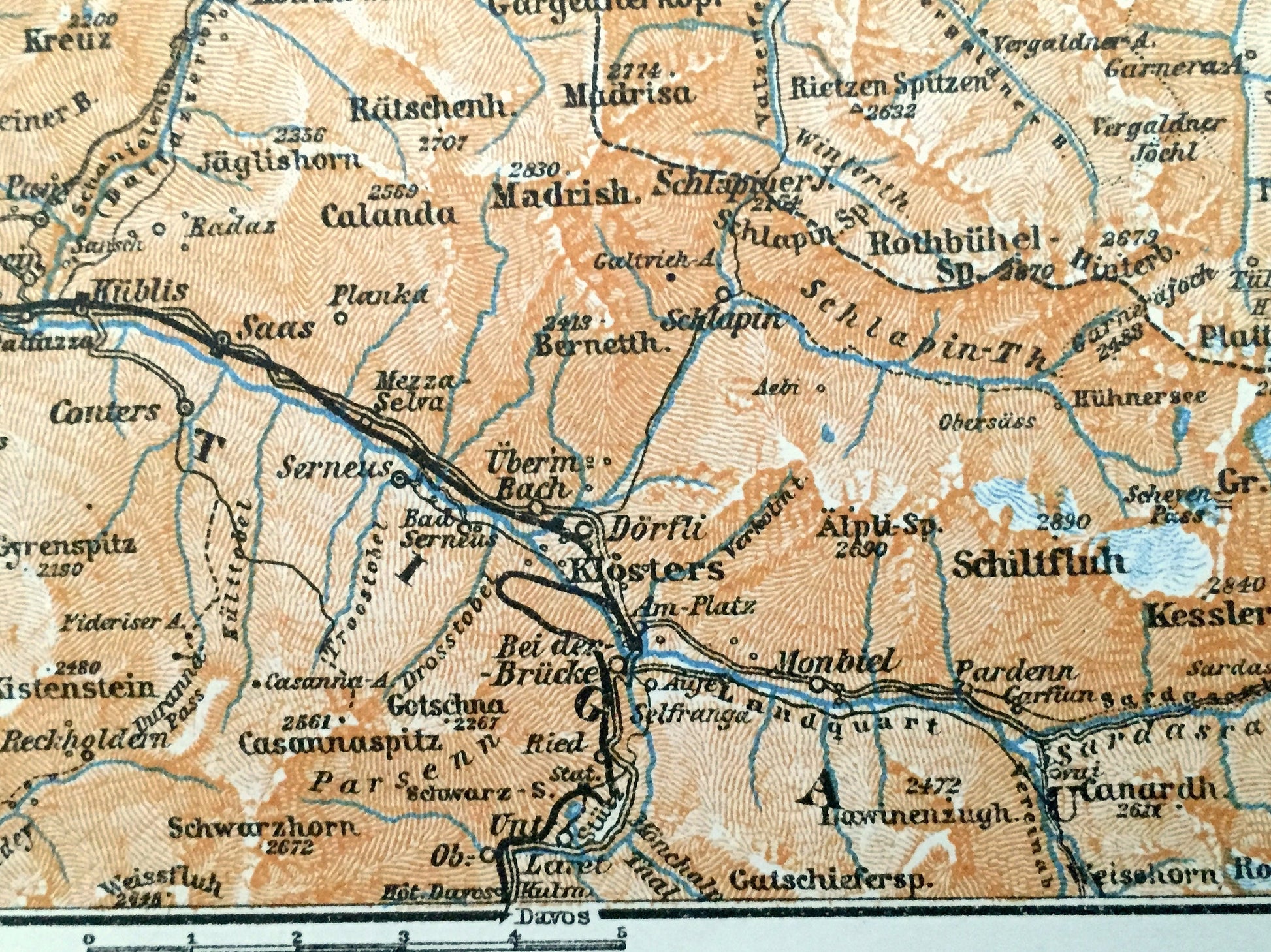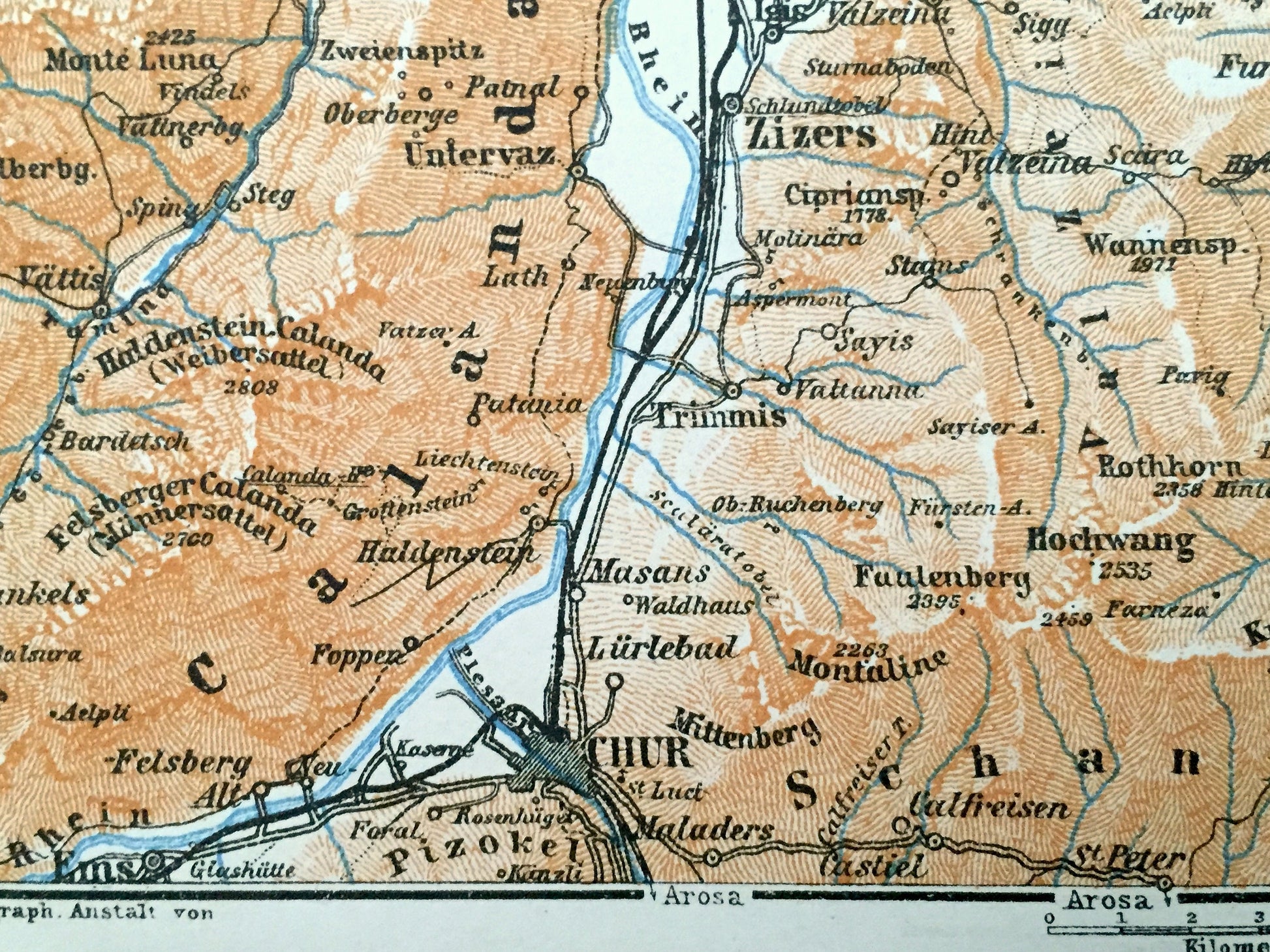 Beautiful, antique map of the Maienfeld alps area in the Landquart Region in the Swiss canton of Graubünden. This is an authentic print from "Baedeker's Handbook for Travelers: Switzerland," published in 1913 and NOT a computer reproduction.