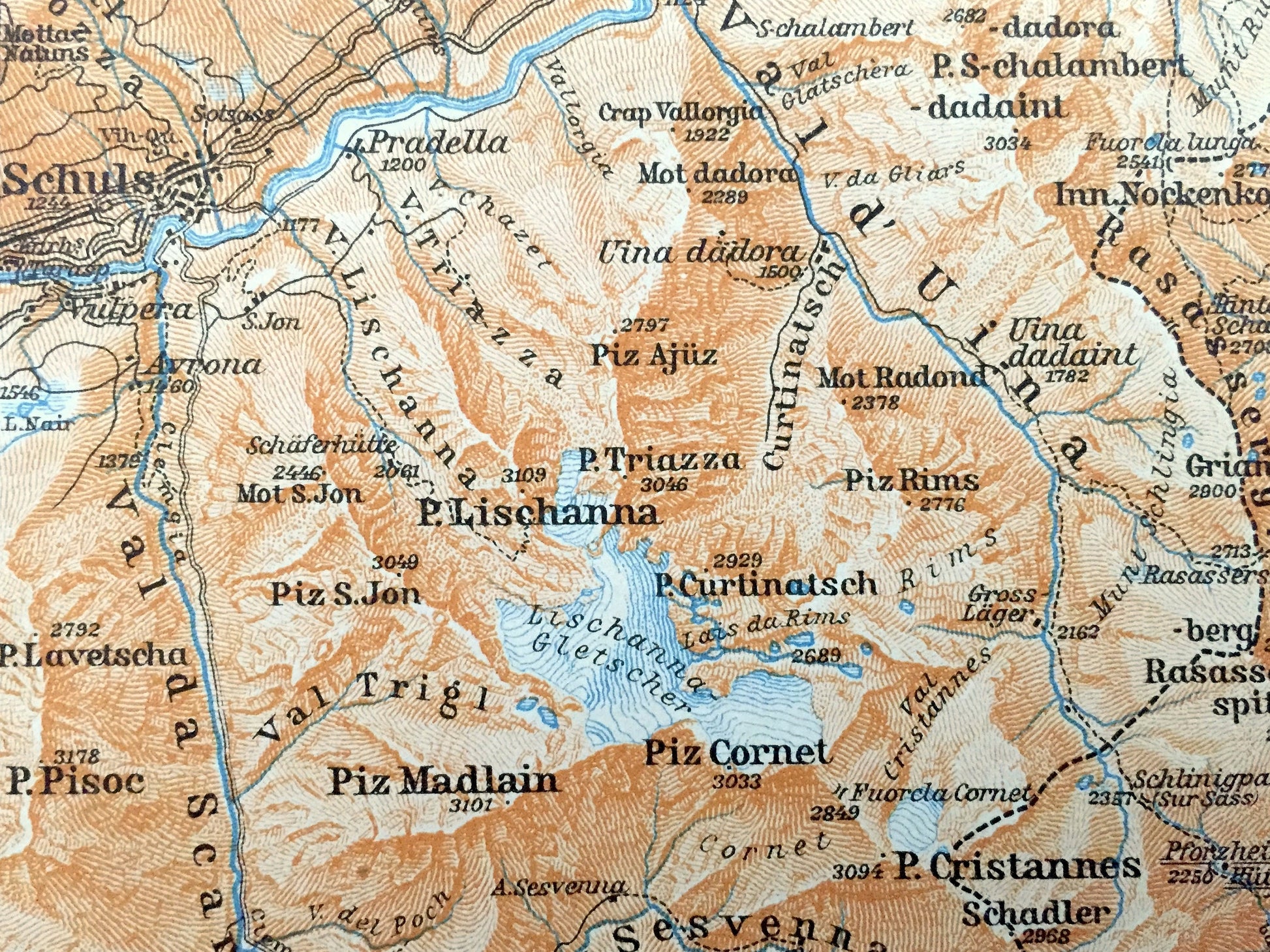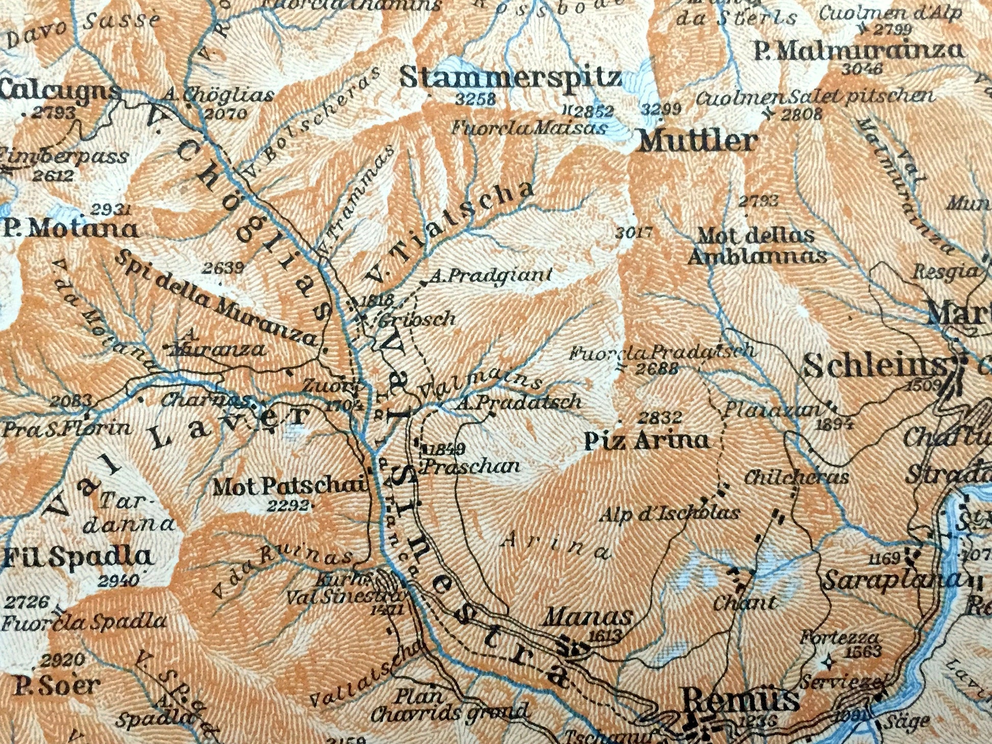 Beautiful, antique double-sided map of Schuls, Martinsburck, Remus & Sent, Switzerland and surrounding Grisons Canton area. This is an authentic print from "Baedeker's Handbook for Travelers: Switzerland," published in 1913 and NOT a computer reproduction.