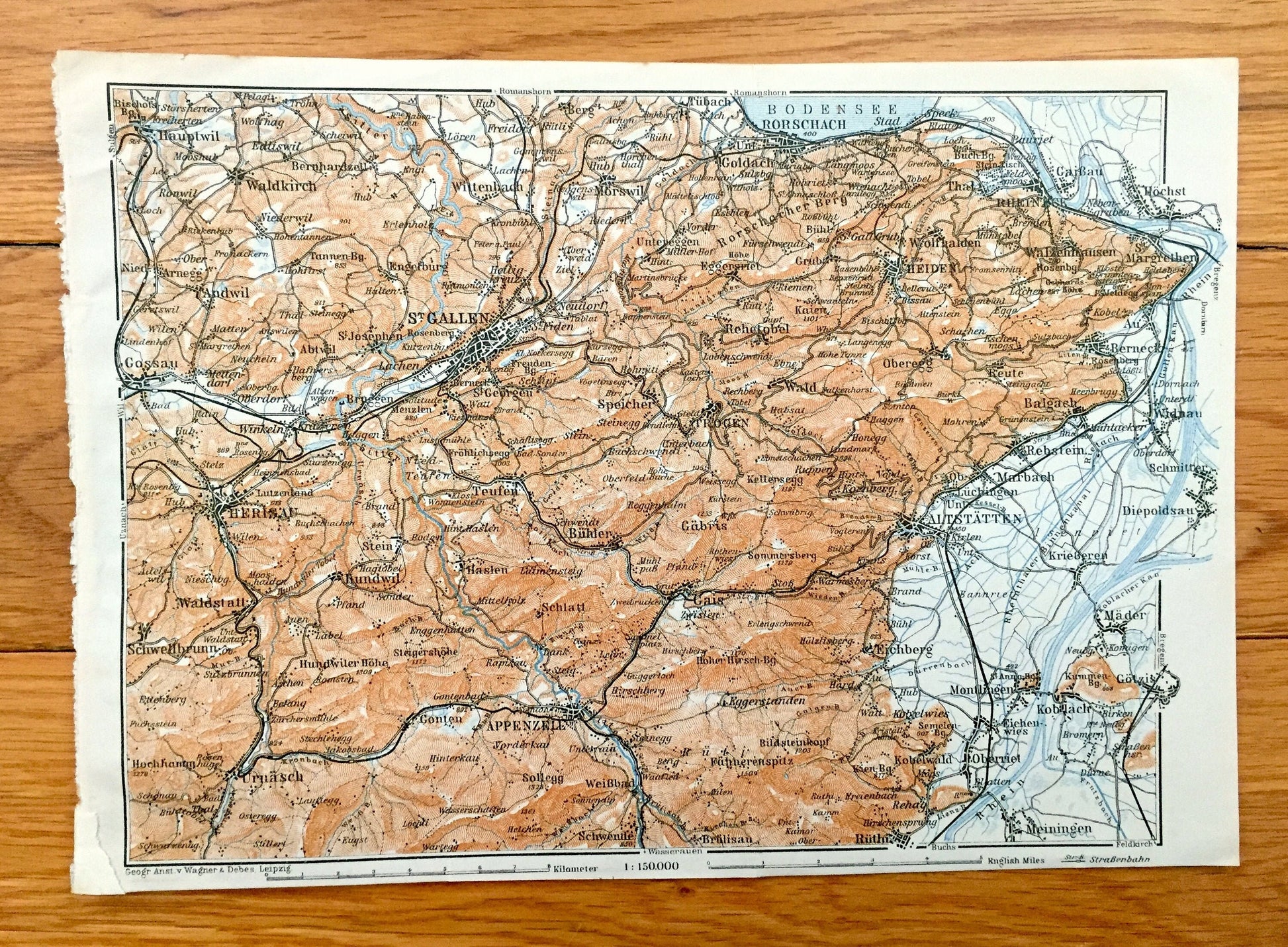Antique 1913 St Gallen, Switzerland Map from Baedekers Guide Atlas – Herisau, Appenzal, Altstätten, Rorschach, Teufen, Trogen, Andwil