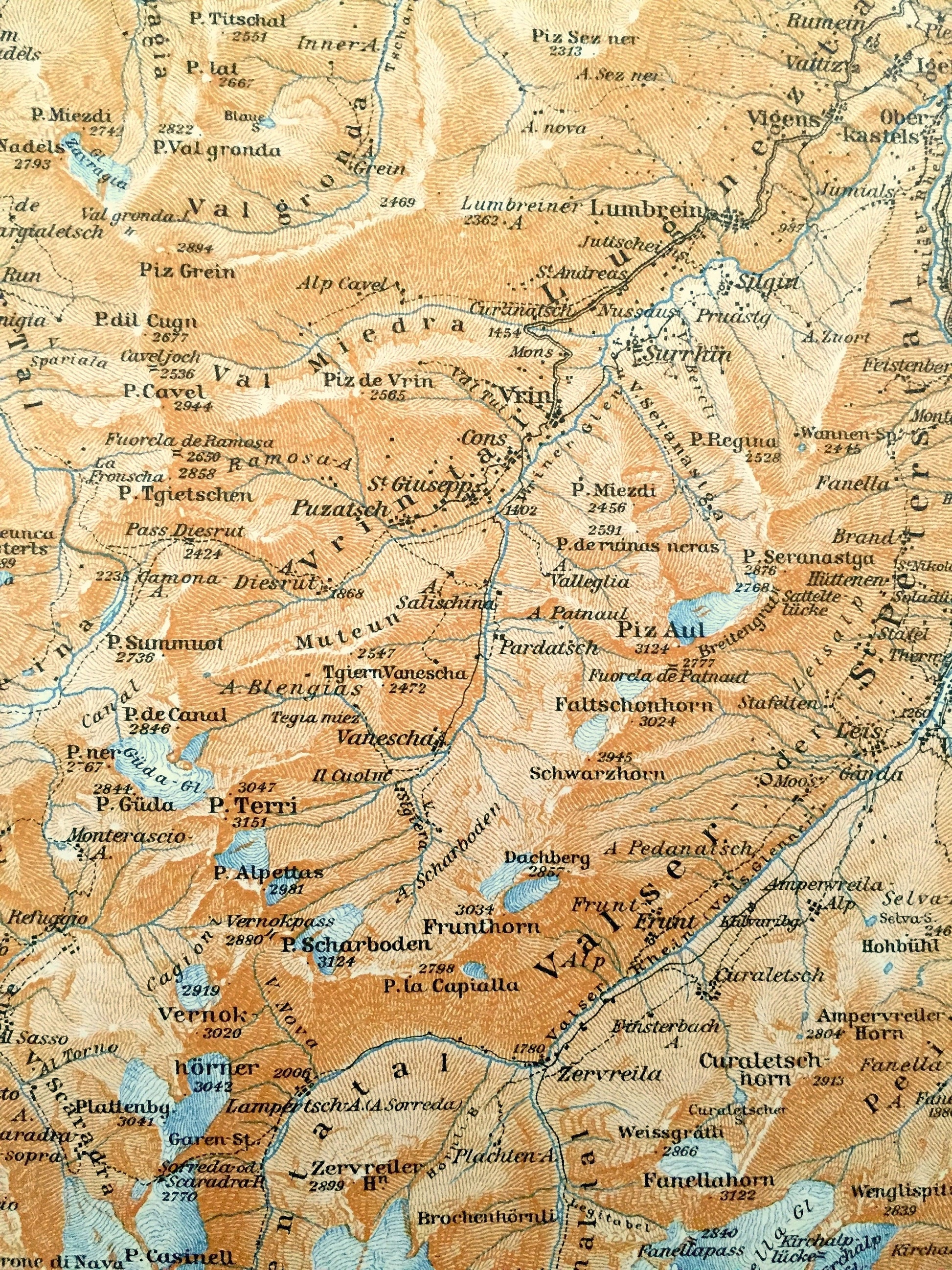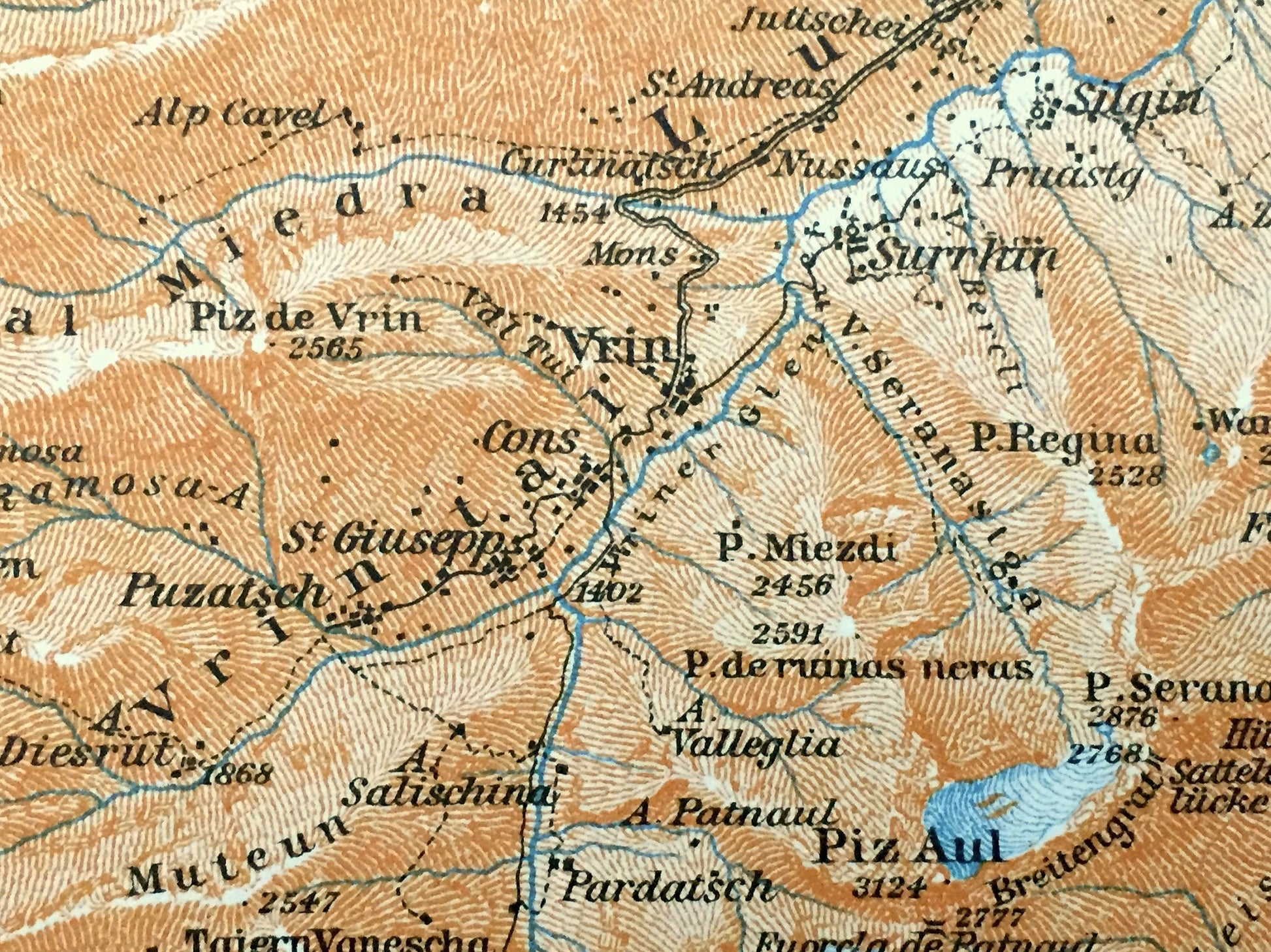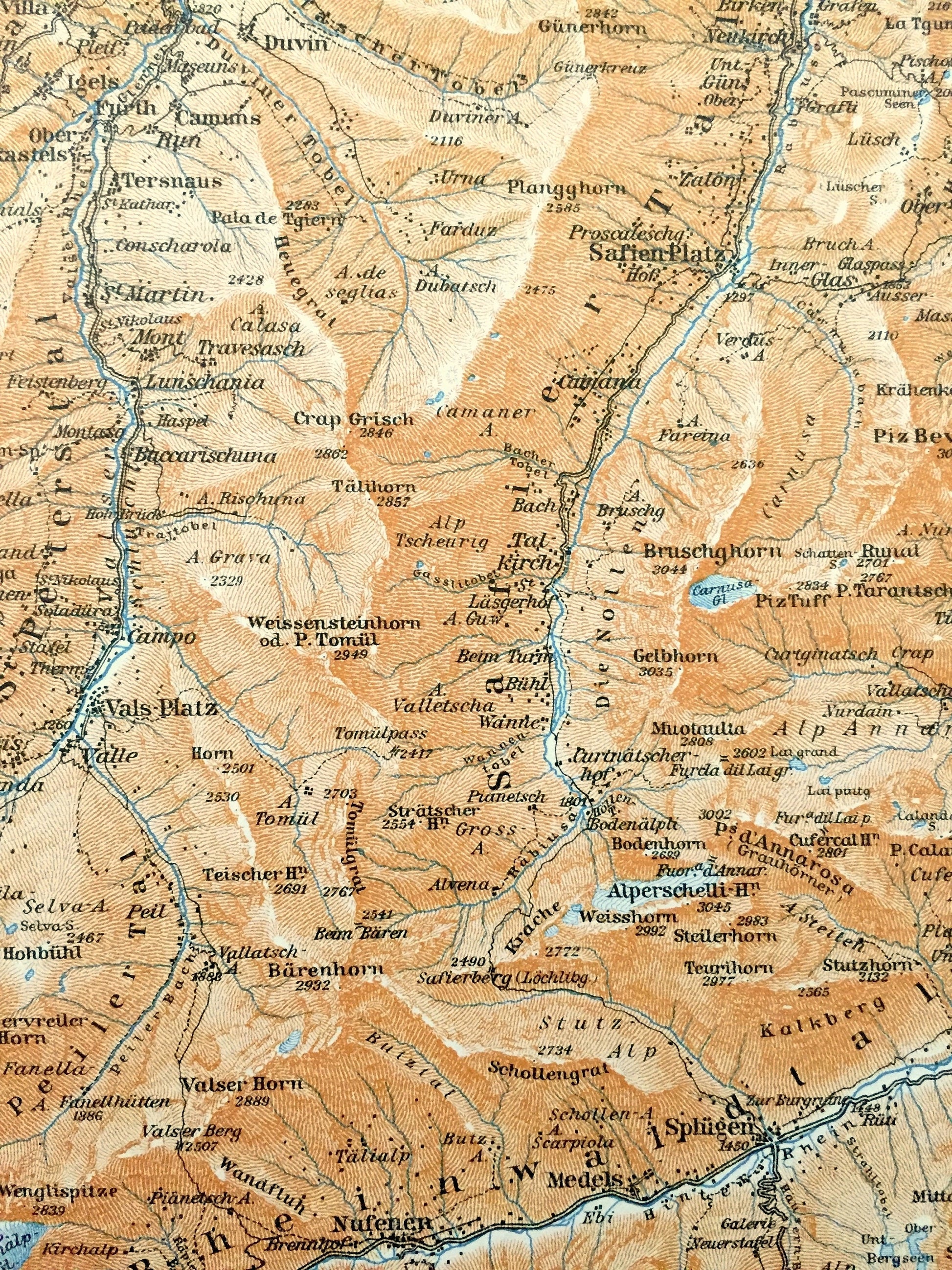 Beautiful, antique map of the Vals Platz alps area in Switzerland and the surrounding Grisons canton region. This is an authentic print from "Baedeker's Handbook for Travelers: Switzerland," published in 1913 and NOT a computer reproduction.