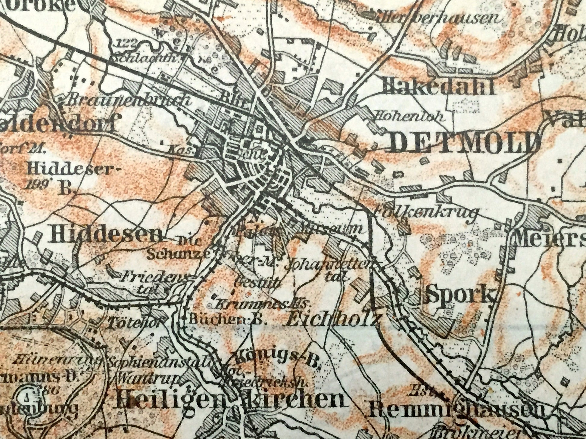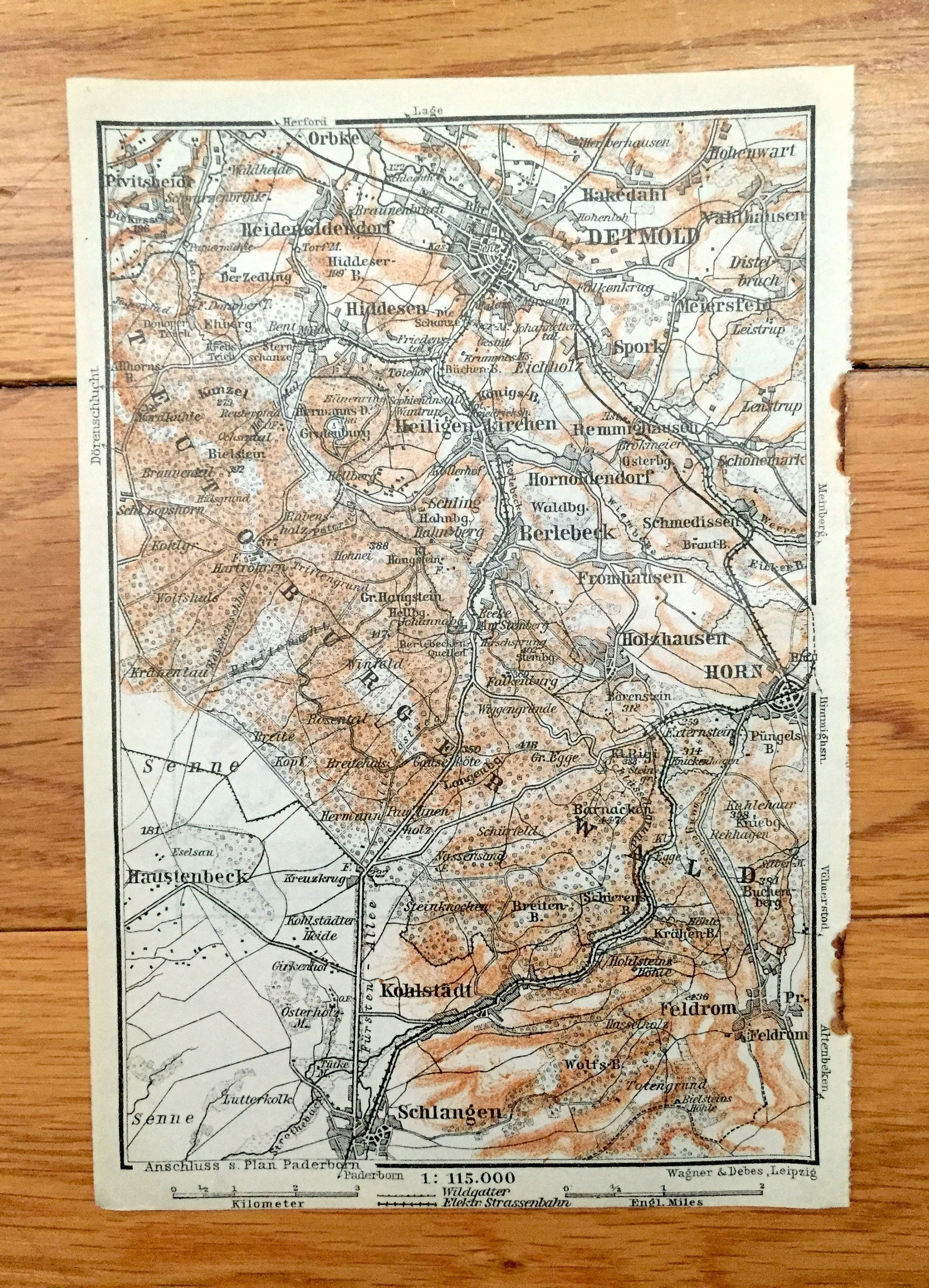 Antique 1925 Detmold, Germany Map from Baedekers Guide Atlas – Schlangen, Kohlstadt, Feldrom, Horn, Berlebeck, Spork, Orbke, Hiddesen