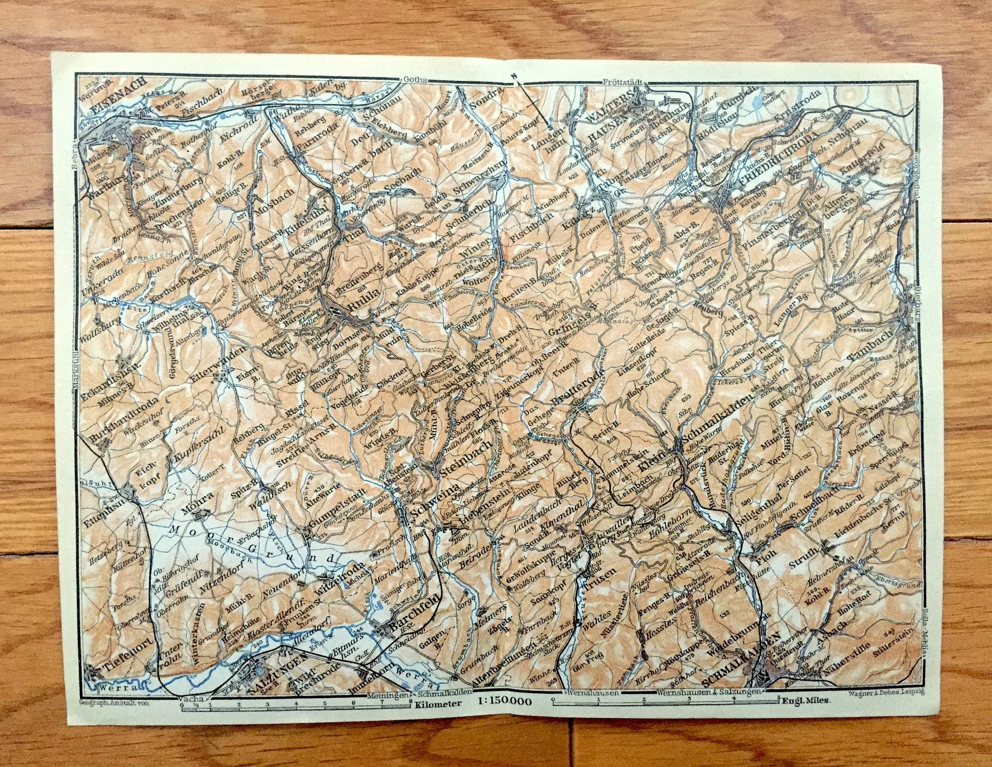 Antique 1925 Friedrichroda, Germany Map from Baedekers Guide Atlas – Hausen, Walters, Schmalkalden, Barchfeld, Salzungen, Eisenach, Ruhla