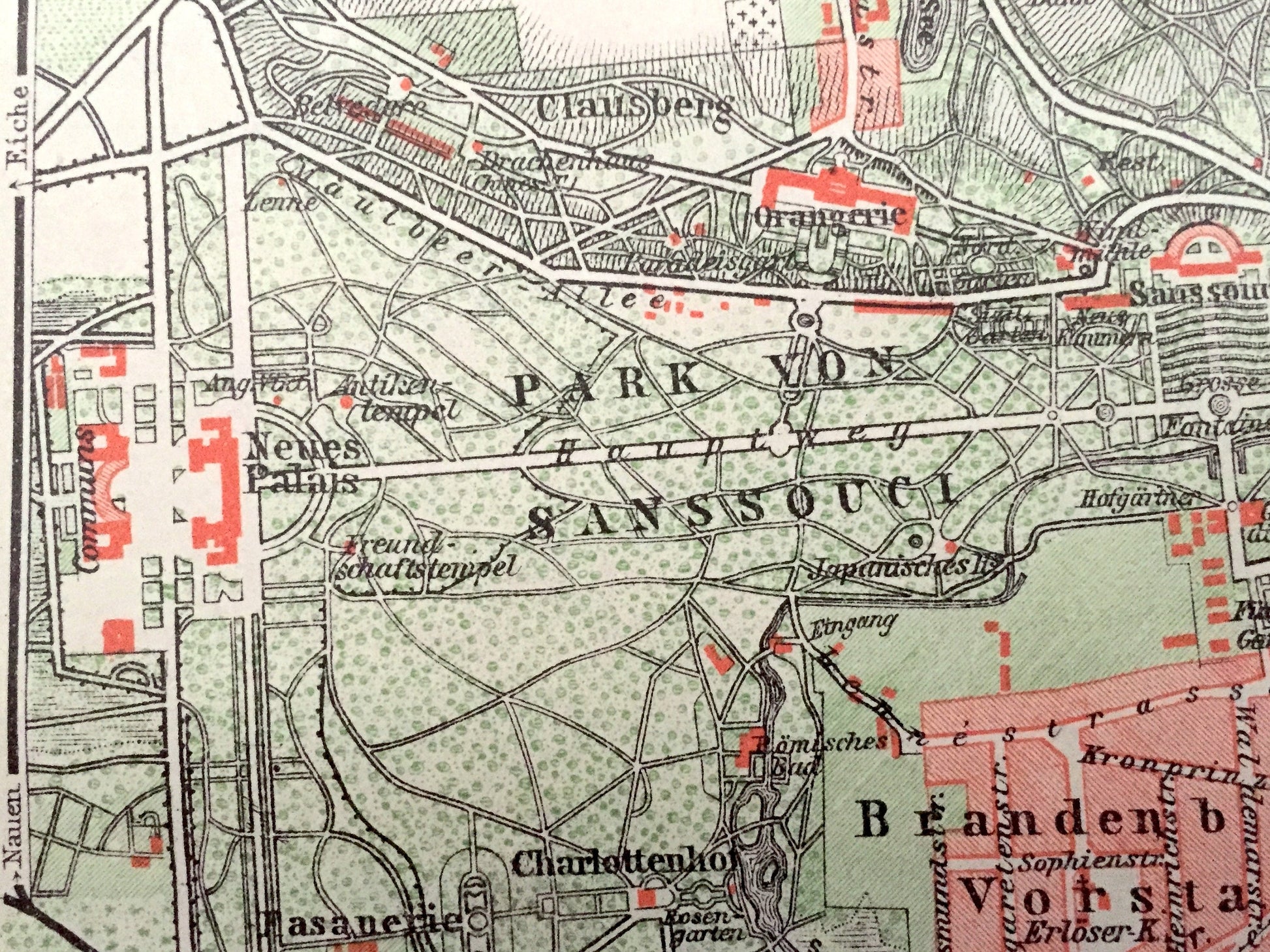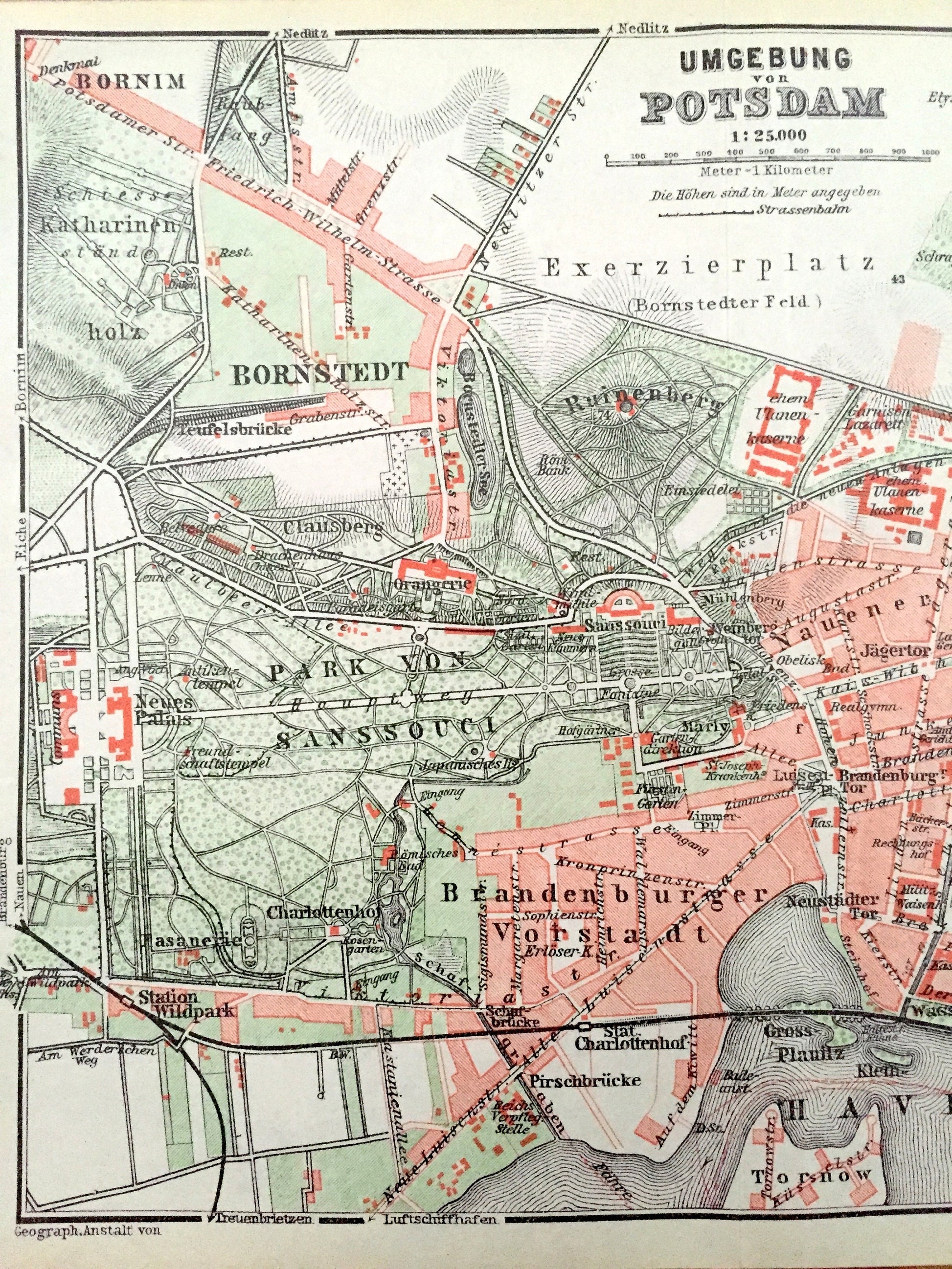 Beautiful, antique map of Potsdam, Germany. This is an authentic print from "Baedeker's Handbook for Travelers: Northern Germany," published in 1925 and is NOT a computer reproduction.
