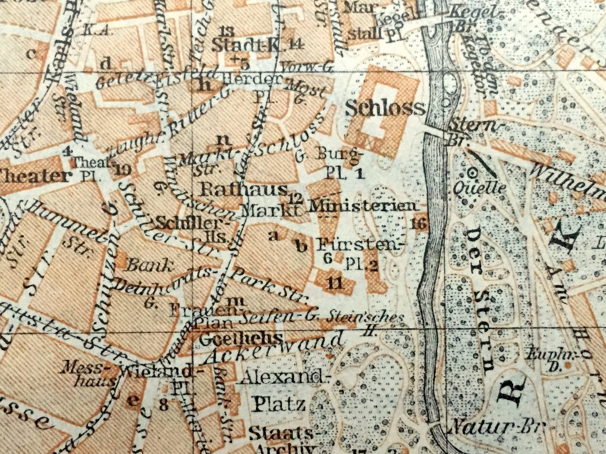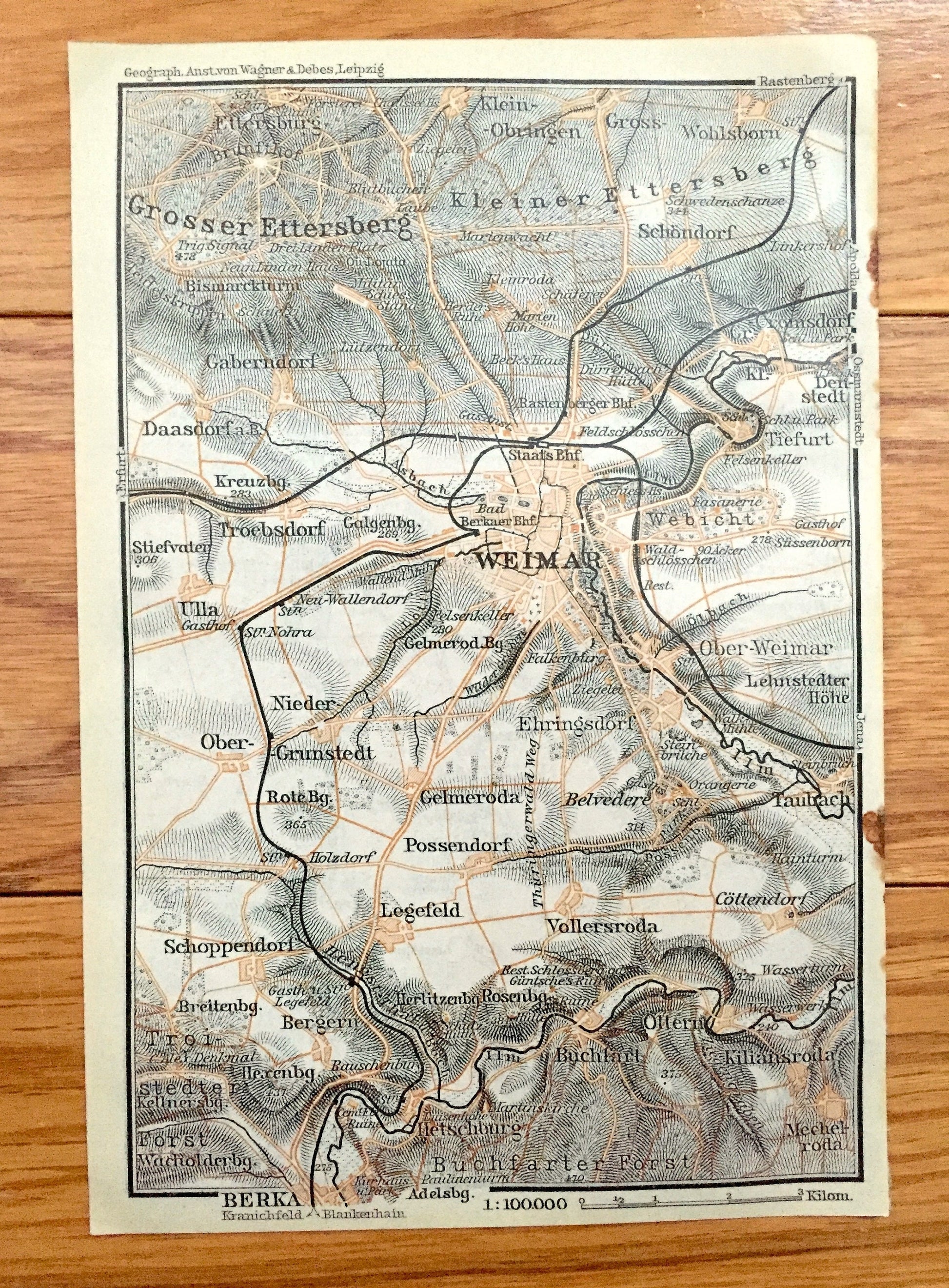 Antique 1925 Weimar, Germany Map from Baedekers Guide Atlas – Thuringia, Taubach, Ottern, Bergern, Ulla, Daasdorf, Troebsdorf, Bauhaus, Ilm