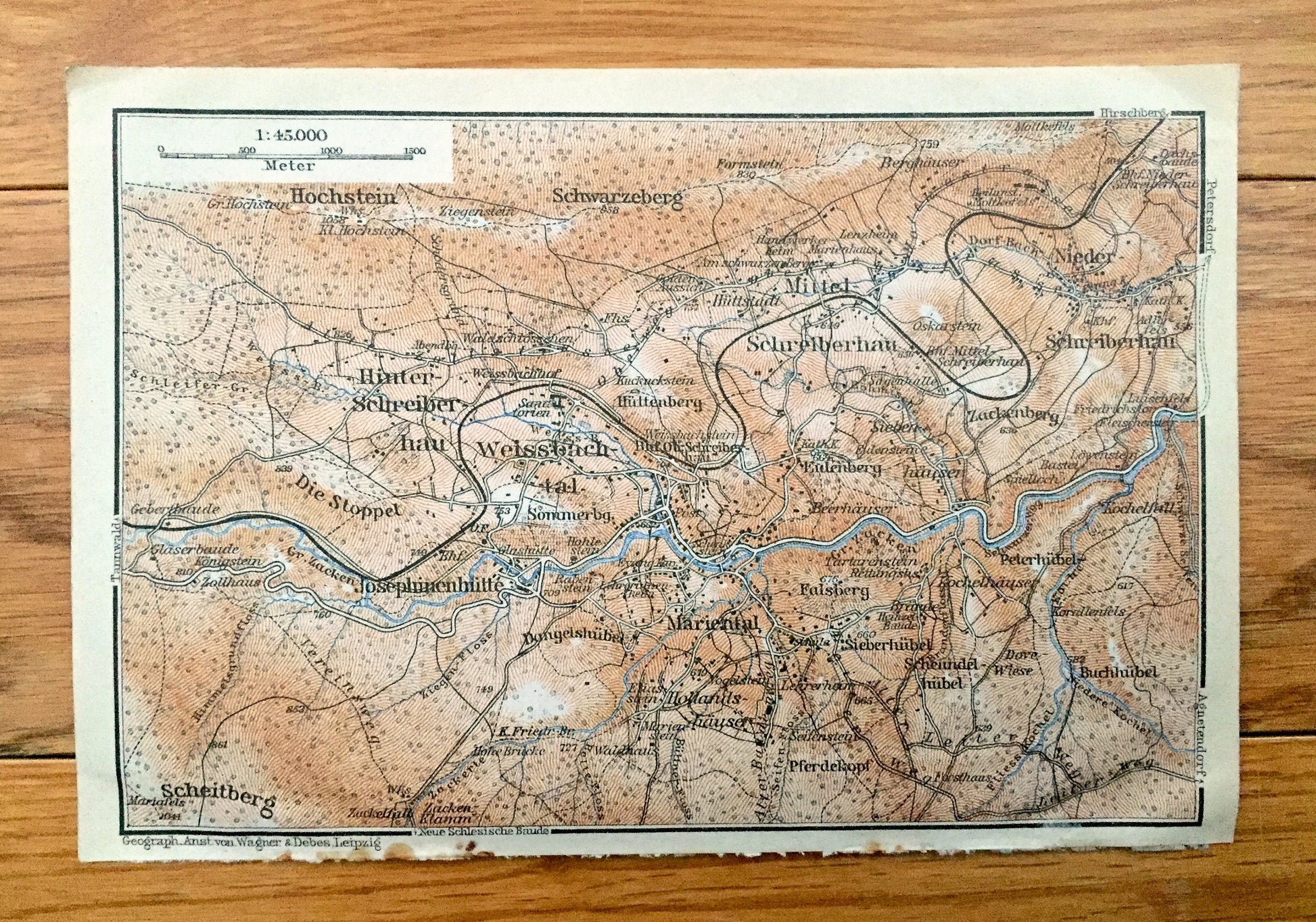 Antique 1925 Weissbachtal, Germany Map from Baedekers Guide Atlas – Hochstein, Scheitberg, Marienthal, Schreiberhau, Hinter-Schreiber