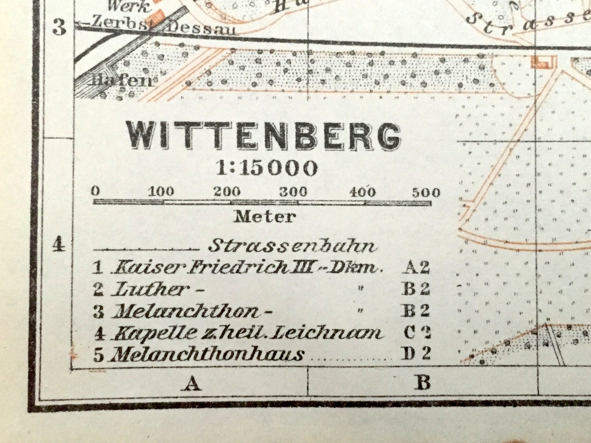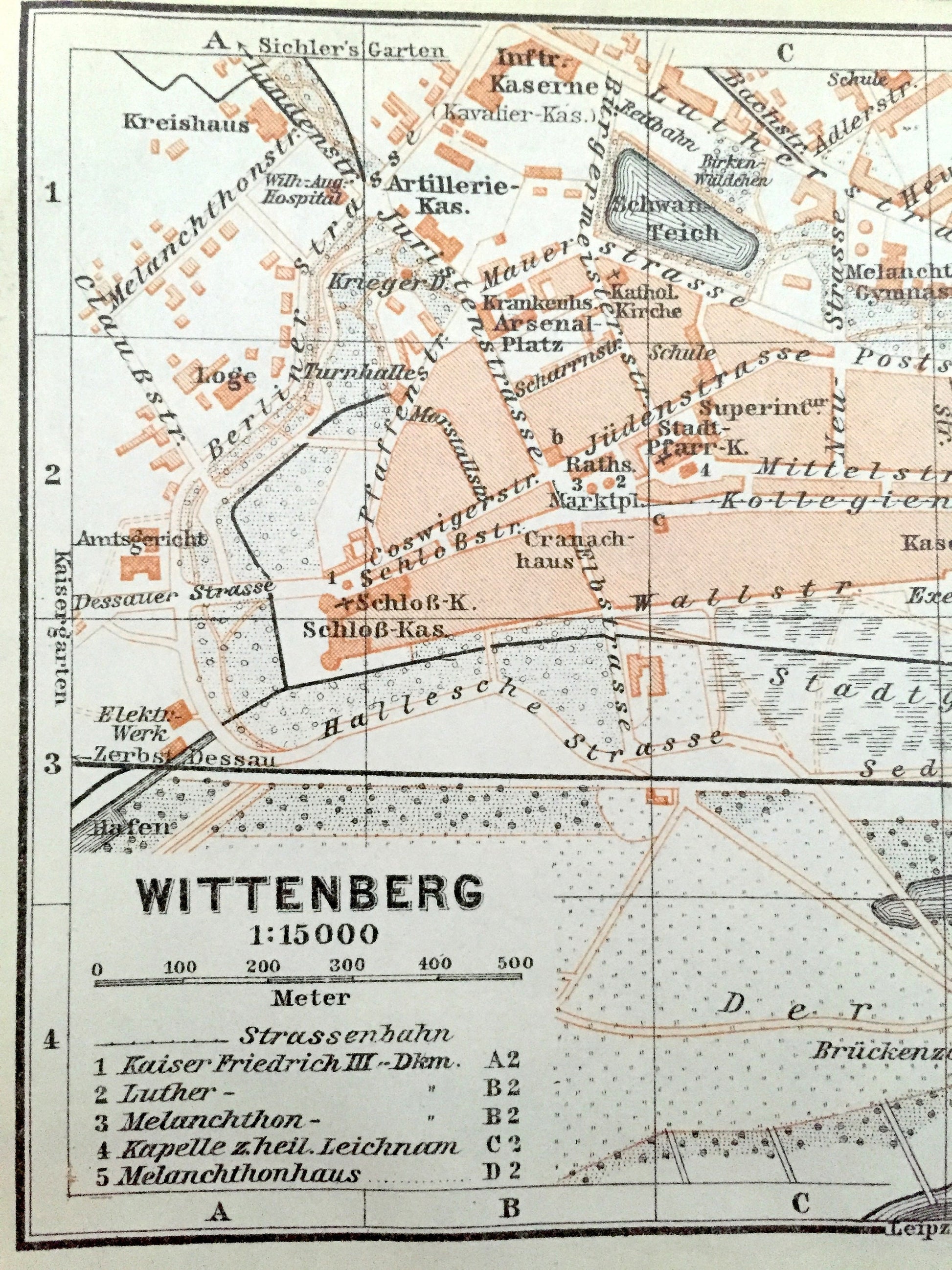 Antique 1925 Wittenberg, Germany Map from Baedekers Guide Atlas – Elbe River, Lutherhaus, Protestant Reformation, Martin Luther, Stadtkirche