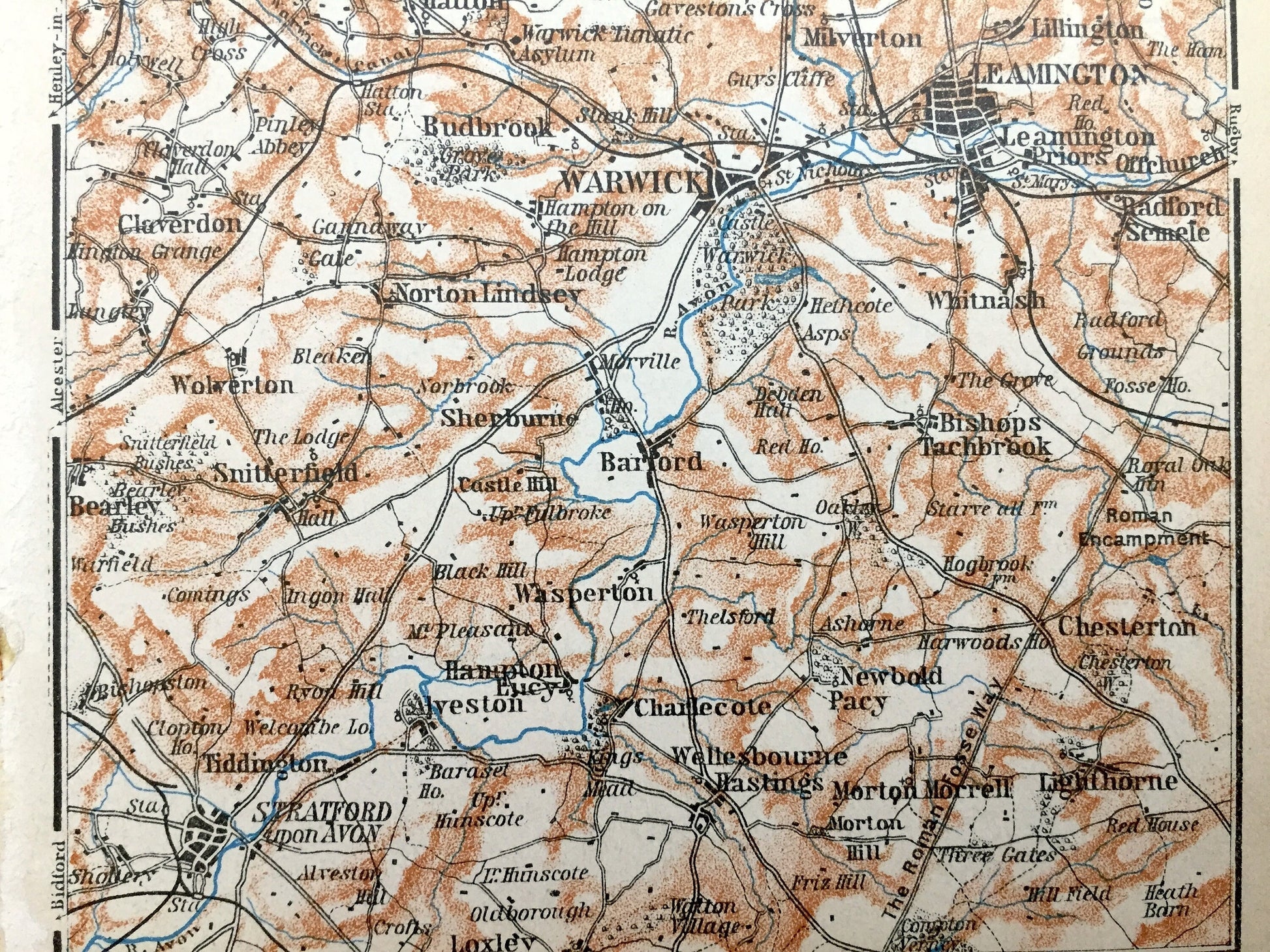 Beautiful, antique map of the Warwickshire countryside between Statford Upon Avon Coventry, England. This is an authentic print from "Baedeker's Great Britain Handbook for Travelers," published in 1927 and NOT a computer reproduction.