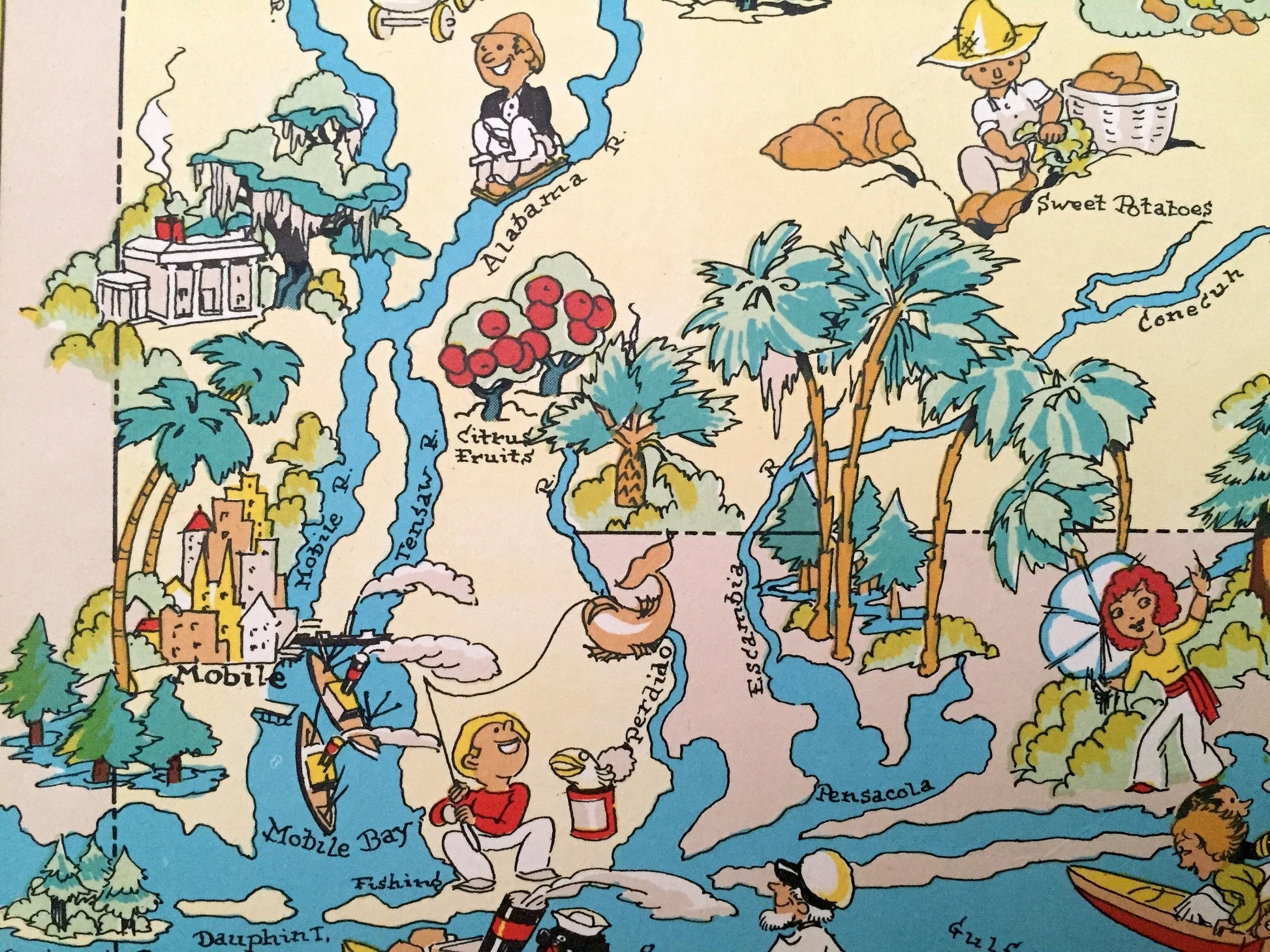 Antique 1935 Alabama State Map from Our Gay Geography by Ruth Taylor – Mobile, Montgomery, Huntsville, Tuskegee, Birmingham, Pensacola, AL