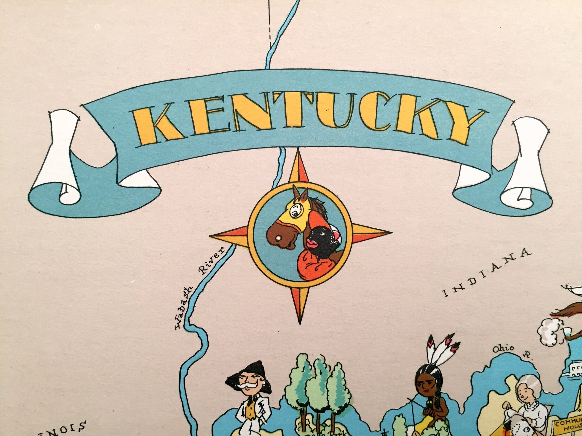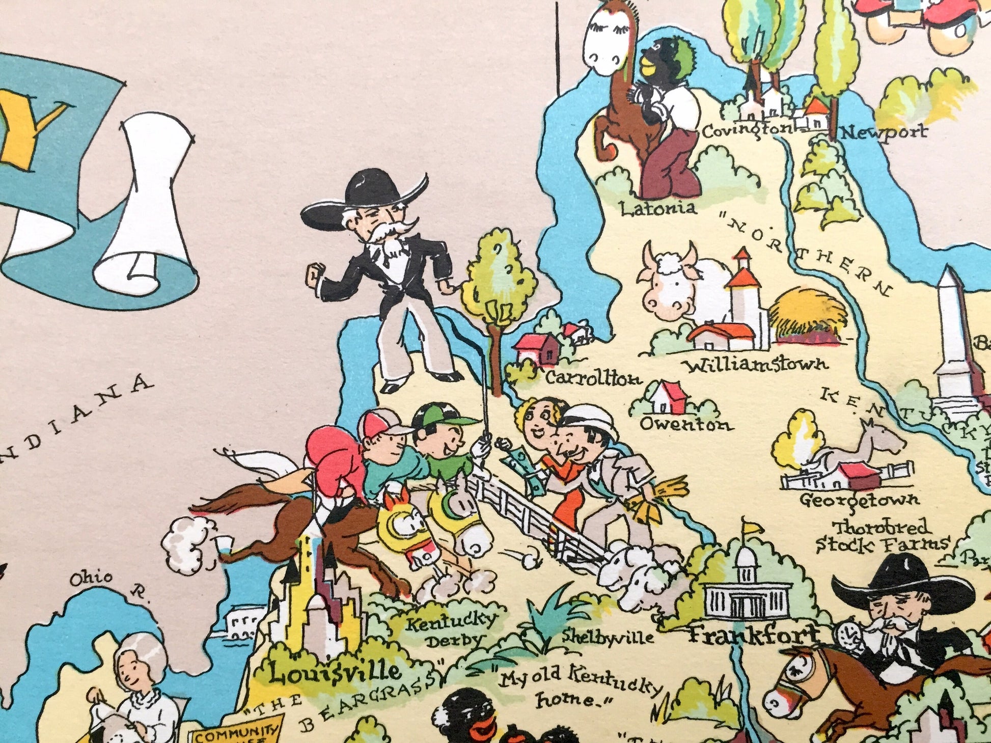See how Kentucky looked 90 years ago, as depicted by renowned illustrator Ruth Taylor. Lots of charming, intricate illustrations and details, decorative border and geological contours, including industries of the state, mountains, islands, canals and rivers. Verso is a history of Louisiana.