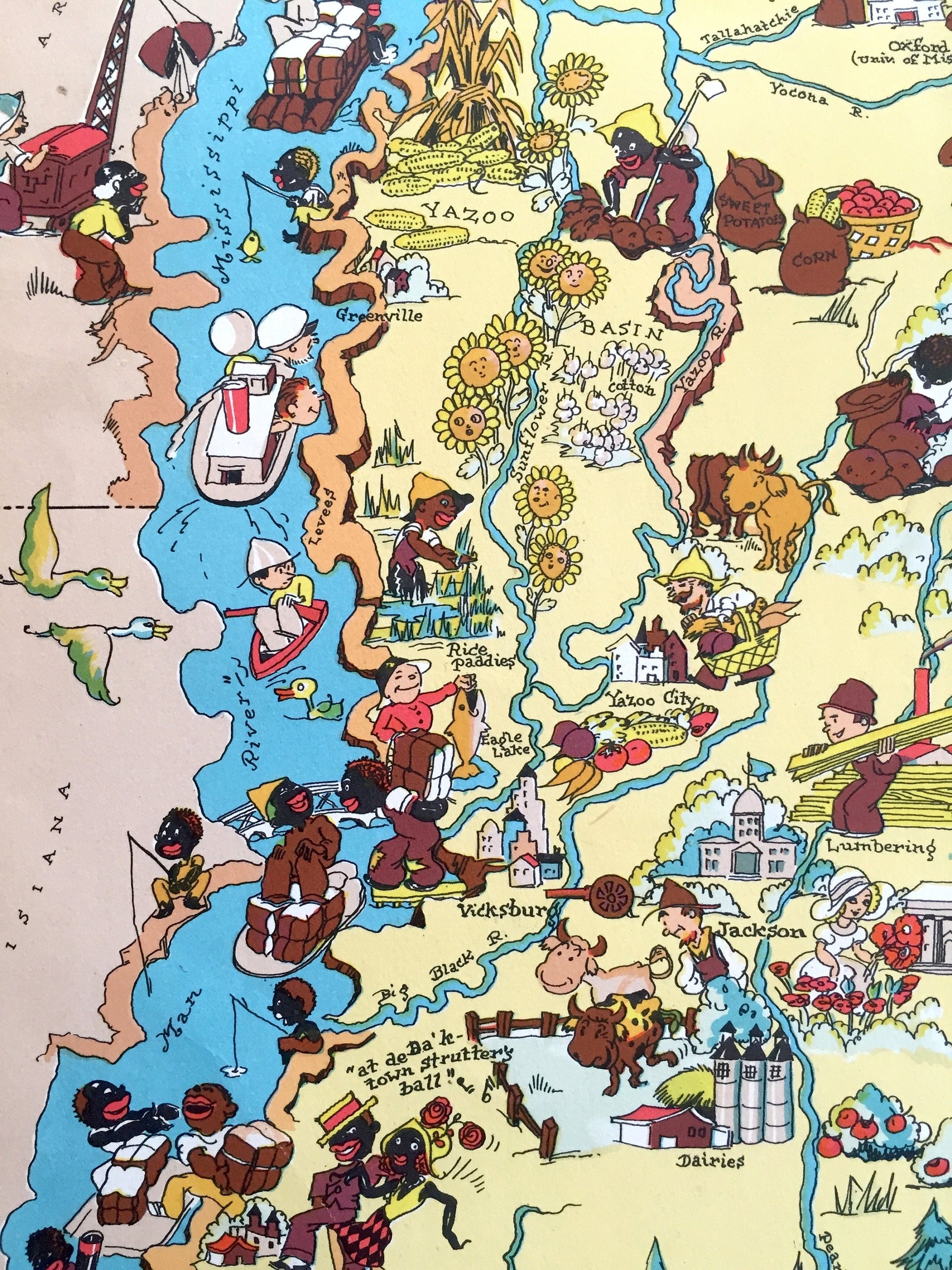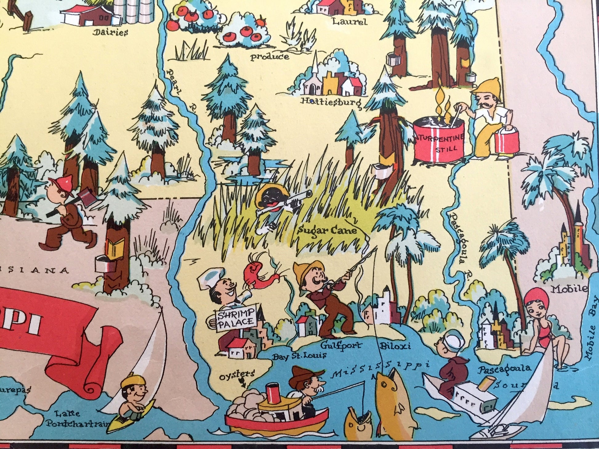Beautiful, antique pictorial map of Mississippi from "Our Gay Geography" by Frank & Ruth Taylor, published in 1935. This is an authentic print removed from the atlas and is NOT a computer reproduction.