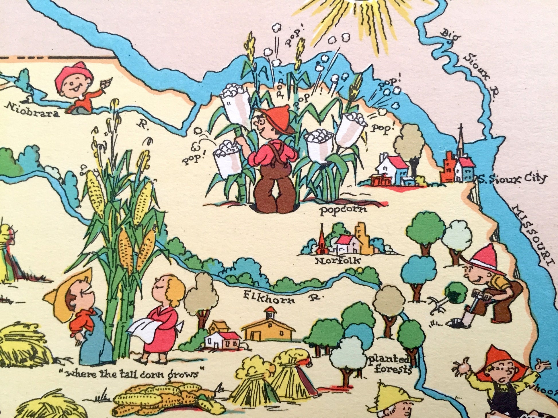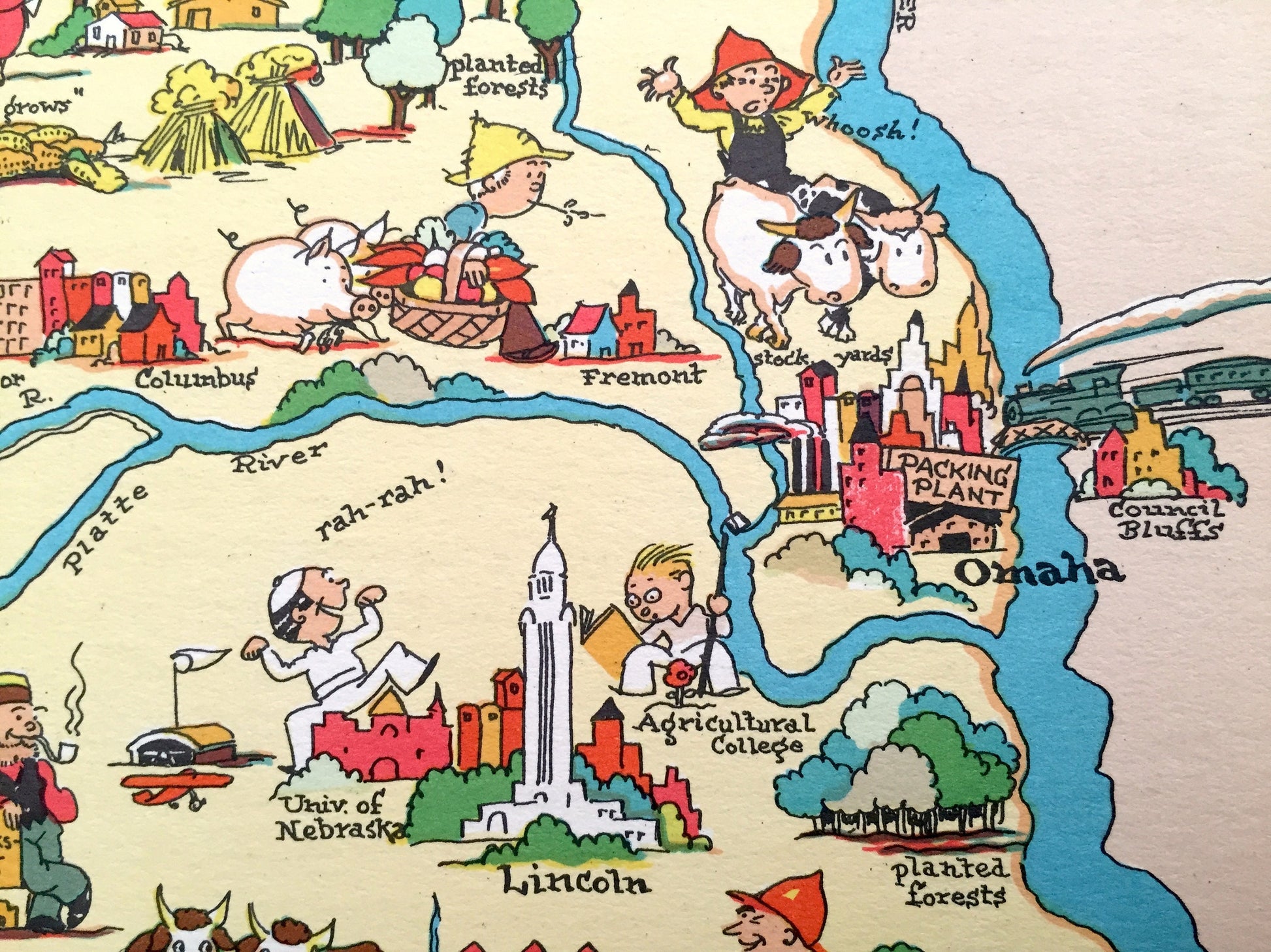 Beautiful, antique pictorial map of Nebraska from "Our Gay Geography" by Frank & Ruth Taylor, published in 1935. This is an authentic print removed from the atlas and is NOT a computer reproduction.