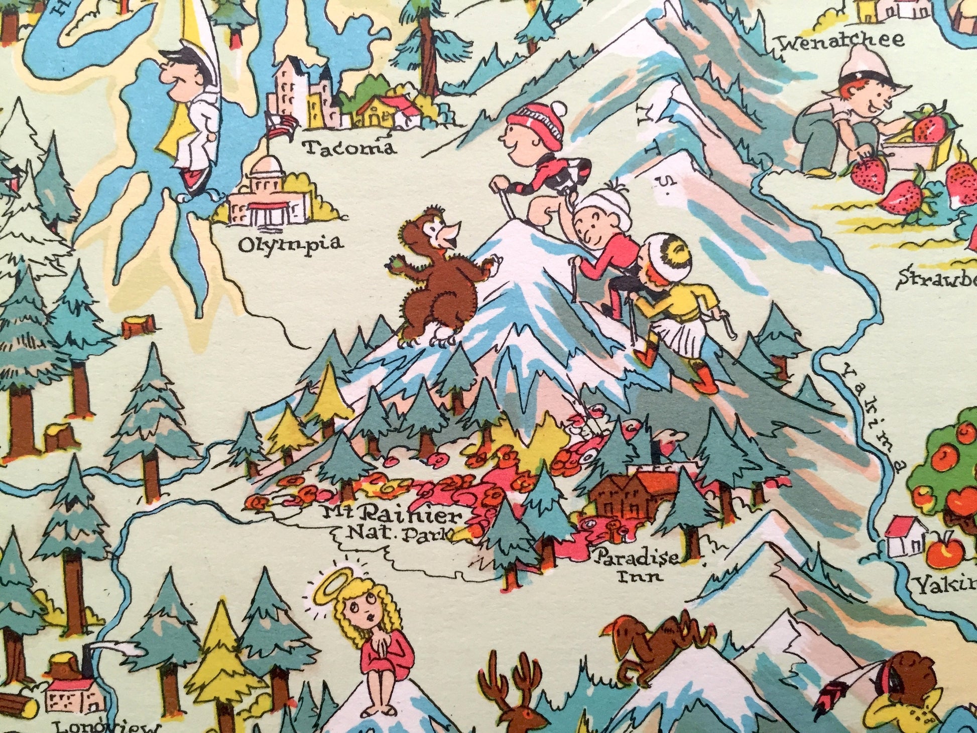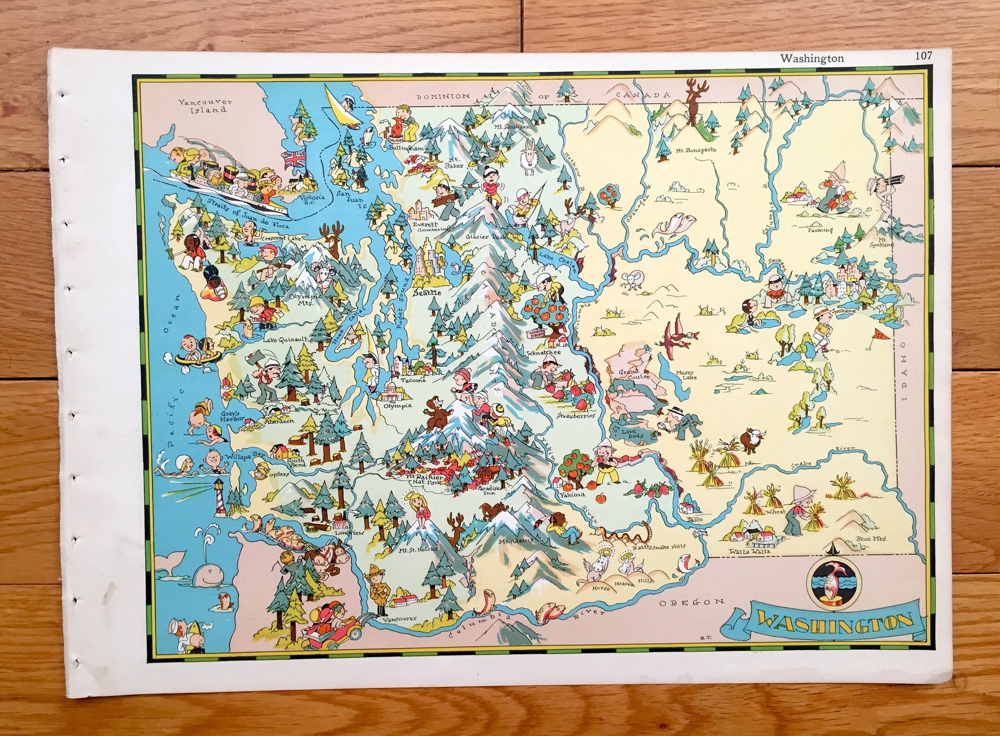 Beautiful, antique pictorial map of Washington State from "Our Gay Geography" by Frank & Ruth Taylor, published in 1935. This is an authentic print removed from the atlas and is NOT a computer reproduction.
