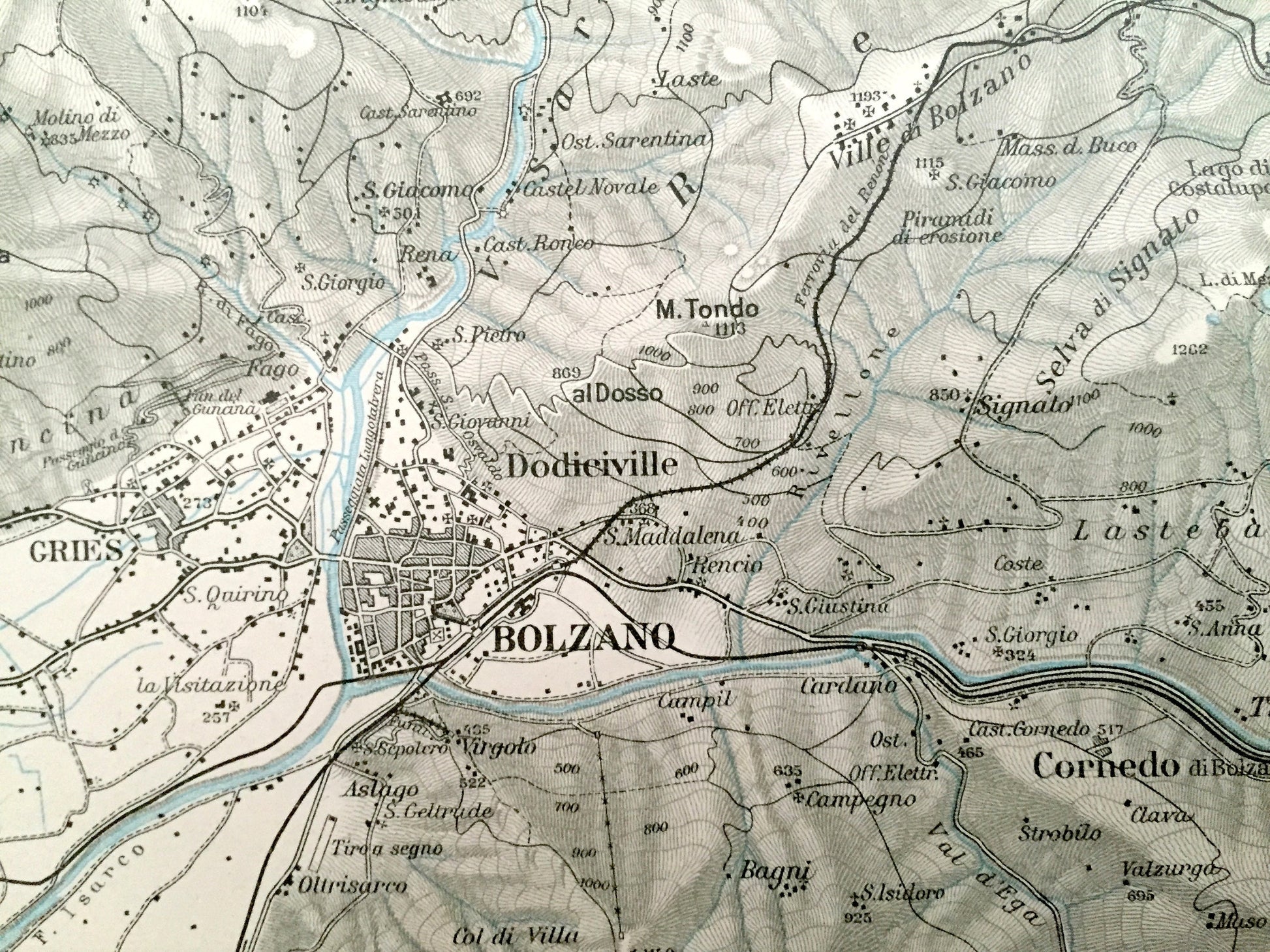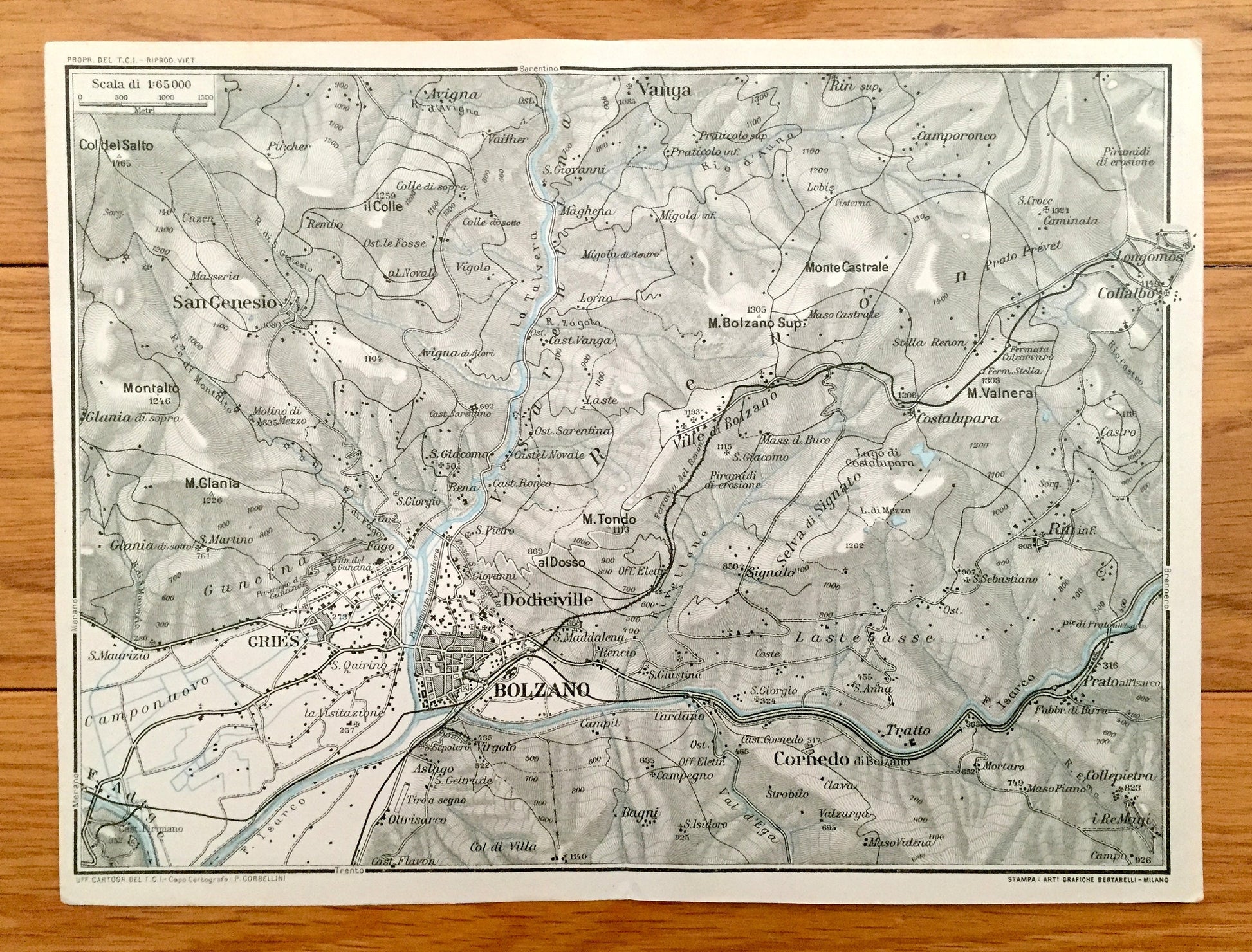 Beautiful, antique map of Bolzano, Italy and surrounding area of South Tyrol. This is an authentic print from "Muirhead's Blue Guide to Northern Italy from the Alps to Rome," published in 1937 and NOT a computer reproduction.