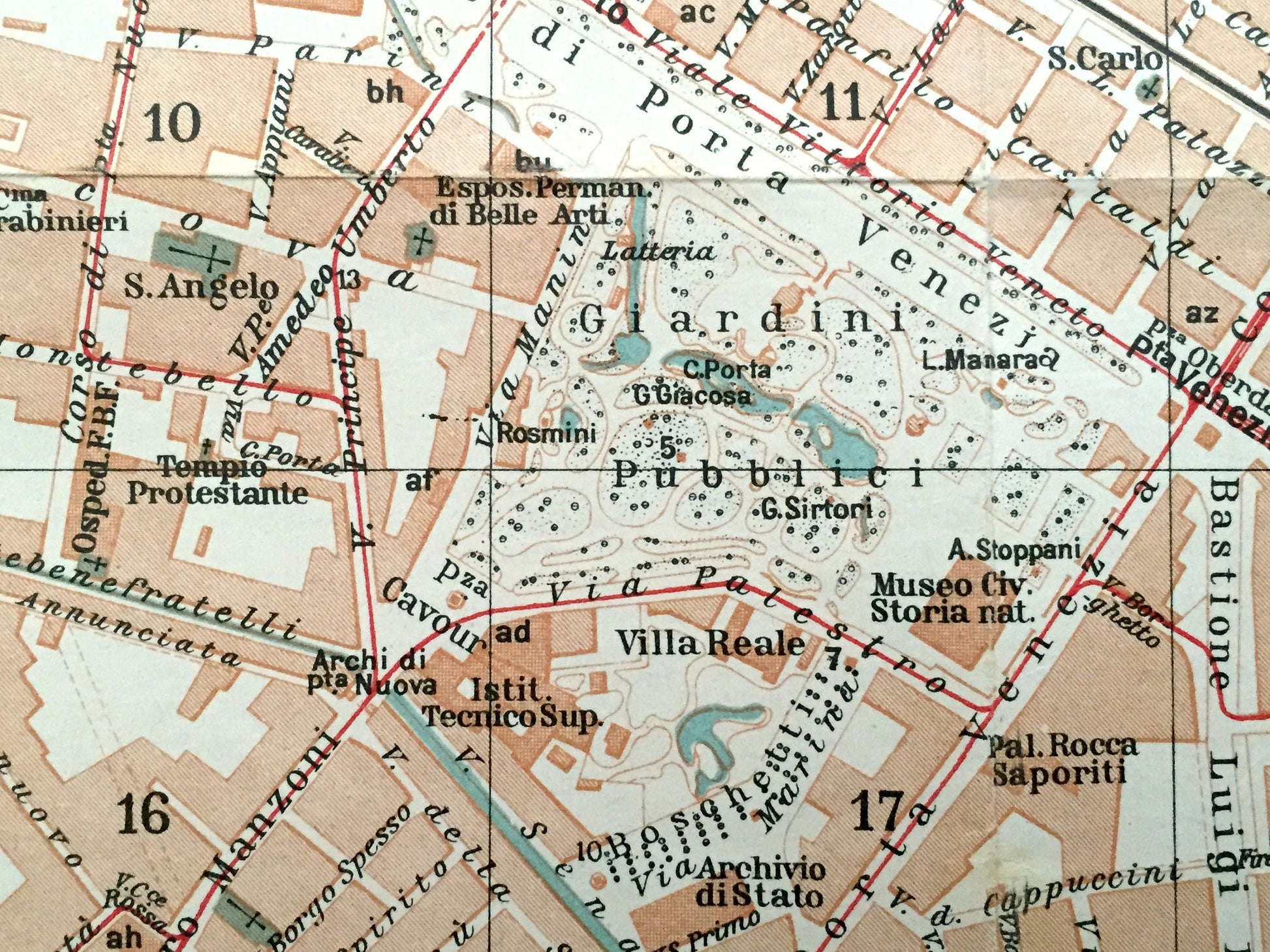 Antique 1937 Milan, Italy Map from Muirhead's Blue Guides & Baedekers – Milano, Lombardy, Castello Sforzesca, Moda, Borgogna, Brera