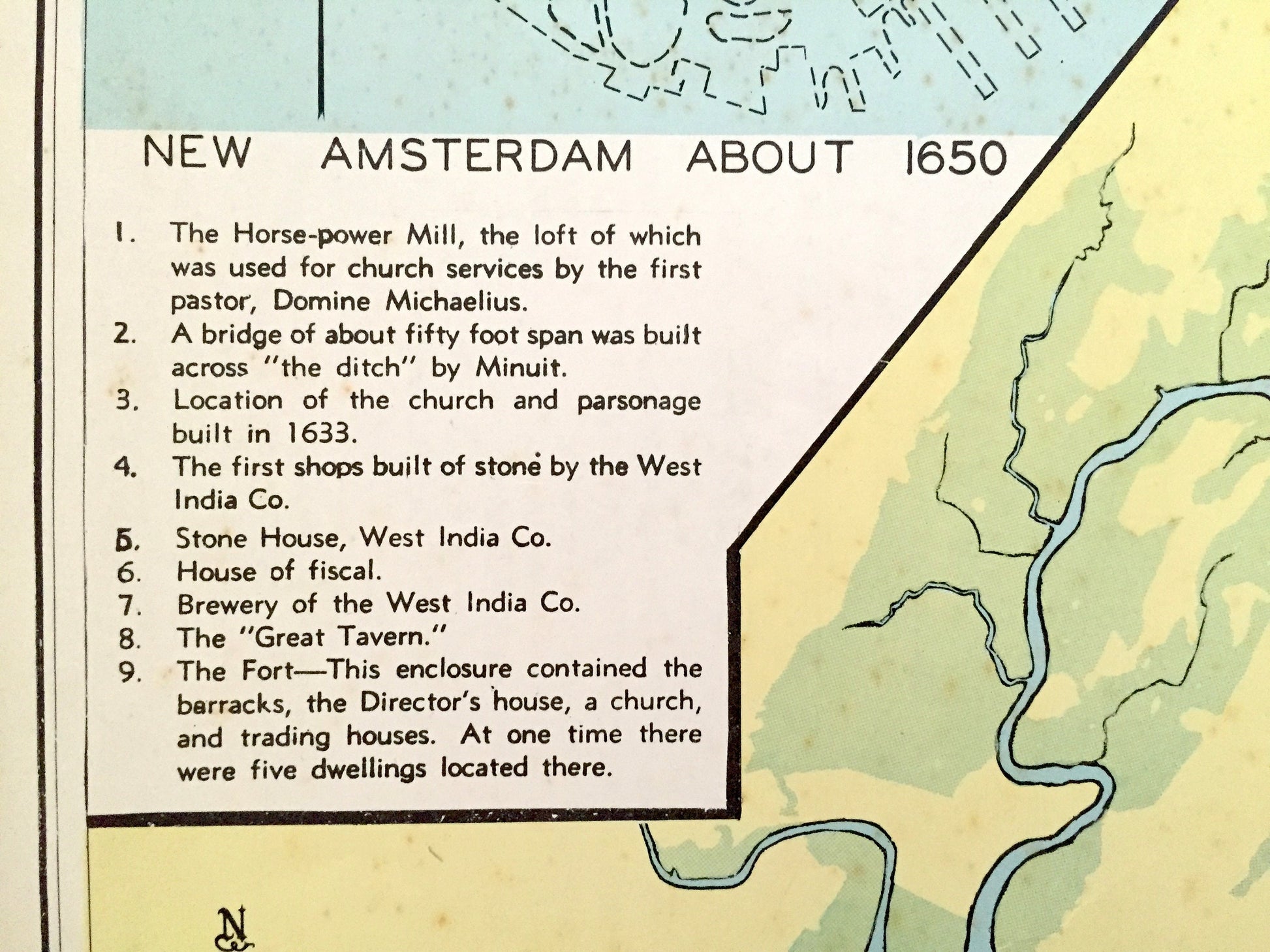 Beautiful, antique map of the Boroughs and Counties of the New York City Region, including an inset of what the island originally looked like when it was New Amsterdam in 1650. This is an authentic map taken from the rare "Historical Atlas of New York State," published in 1941 by Frank E. Richards Co., and is NOT a computer reproduction. The reverse side is are many different historical anecdotes of the city and region