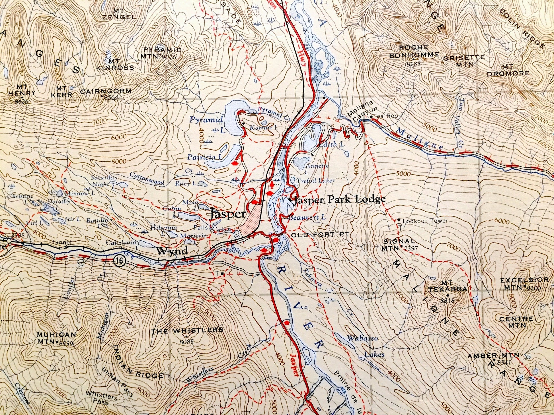 Points of Interest: Jasper National Park, Canadian Rockies, Mount Robson Provincial Park, Rainbow Range, Fraser River, Mt Fitzwilliam, Mt Estella, Holloway Rock, Jasper Lake, Selwyn Range, Jasper Park Lodge, De Smet Range, Victoria Cross Ranges, Athabasca River, Maligne Range, Snake Indian River, Brule Lake, Colin Range, Jacques Range, The Helmet, Rearguard Mountain, Yellowhead, Grant Brook, Lucerne, Red Pass, Alpland, Foster, Emperor, Morey, Swiftwater, Tete Jaune Cache, Jackman, Tete Jaune, Decoigne, Geikie, Wynd, Snaring, Devona, Pocahontas, Miette, Old Entrance, Brúle Mines, and many more roads, houses, rivers, mountains, glaciers, peaks, ponds, lakes, and, cities, towns, mines and hills.