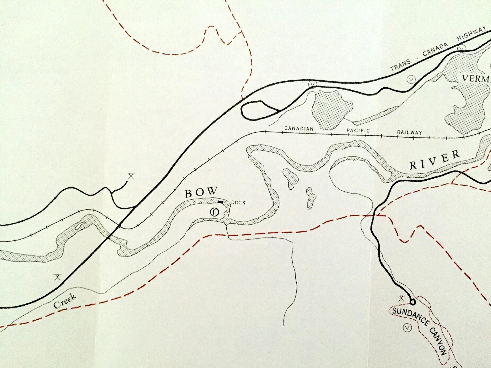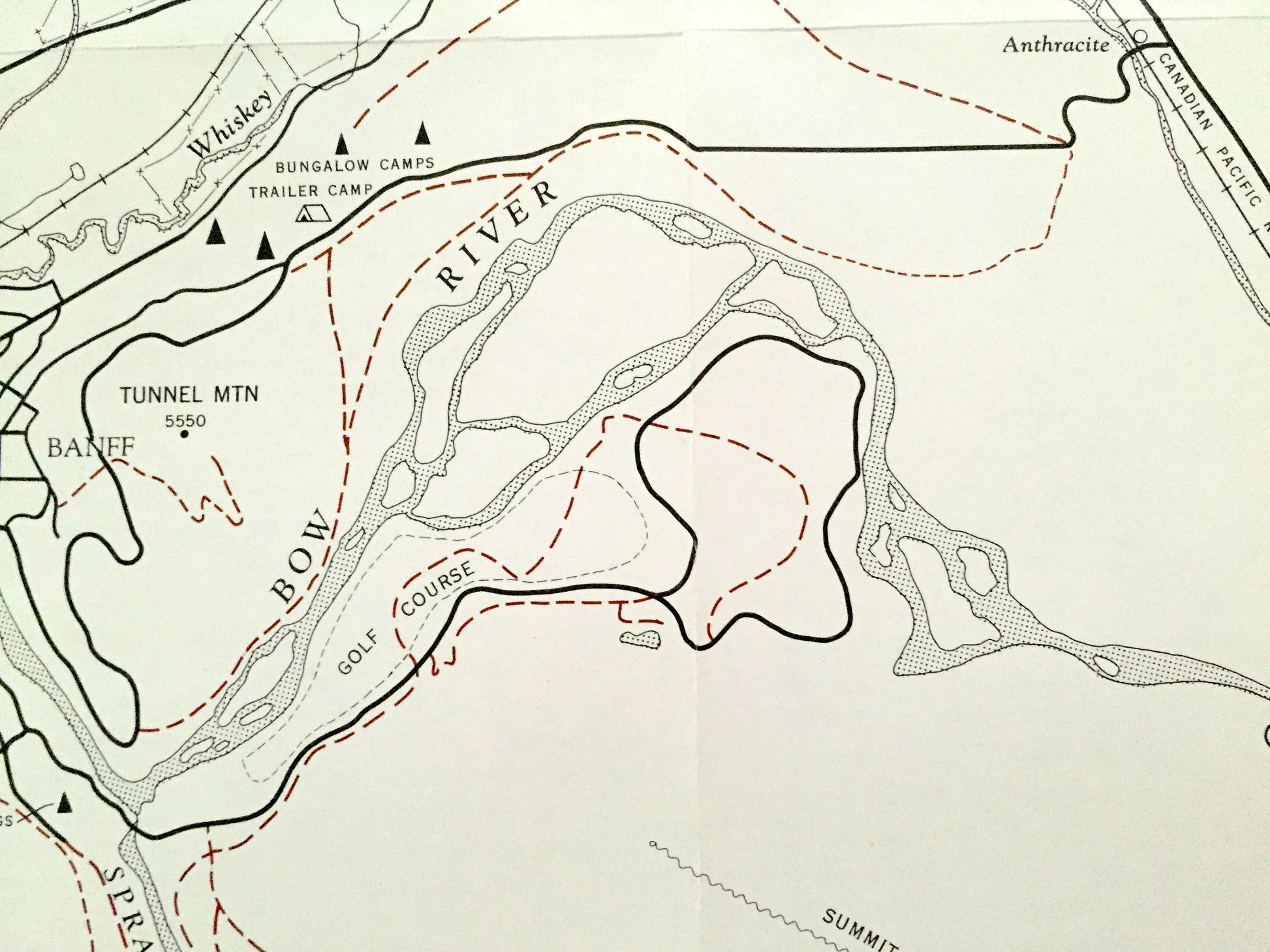 Points of Interest: Banff National Park, Canadian Rockies, Bow River, Cascade River, Lake Minnewanka, Spray River, Stoney Squaw Mountain, Mt Norqouay Lodge, Tunnel Mountain, Sundance Range, Sulphur Mountain, Edith Pass, Cascade Mountain, Amphitheatre, Two Jack Lake, Johnson Lake, Sanson Peak, Alpine Club of Canada, Banff Springs Hotel, and many more roads, buildings, creeks, mountains, ponds, and hills.
