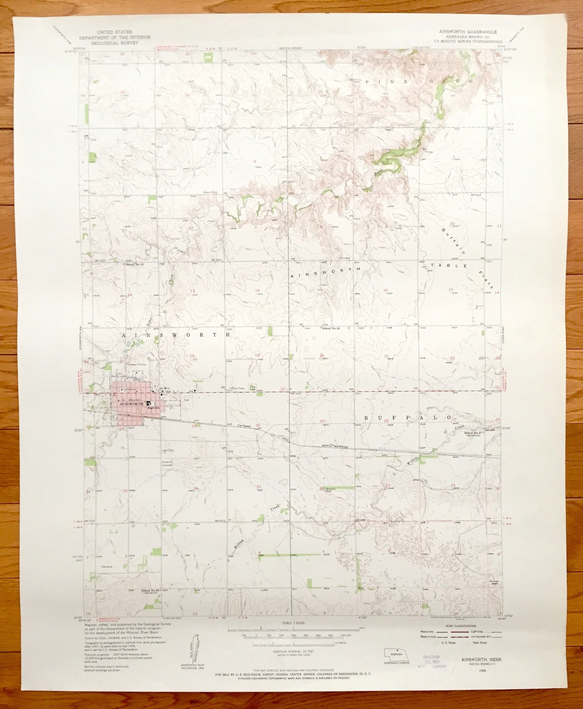 Beautiful, antique map of Ainsworth, Nebraska. This is an authentic 1954 print from the U.S. Geological Survey and NOT a computer reproduction.