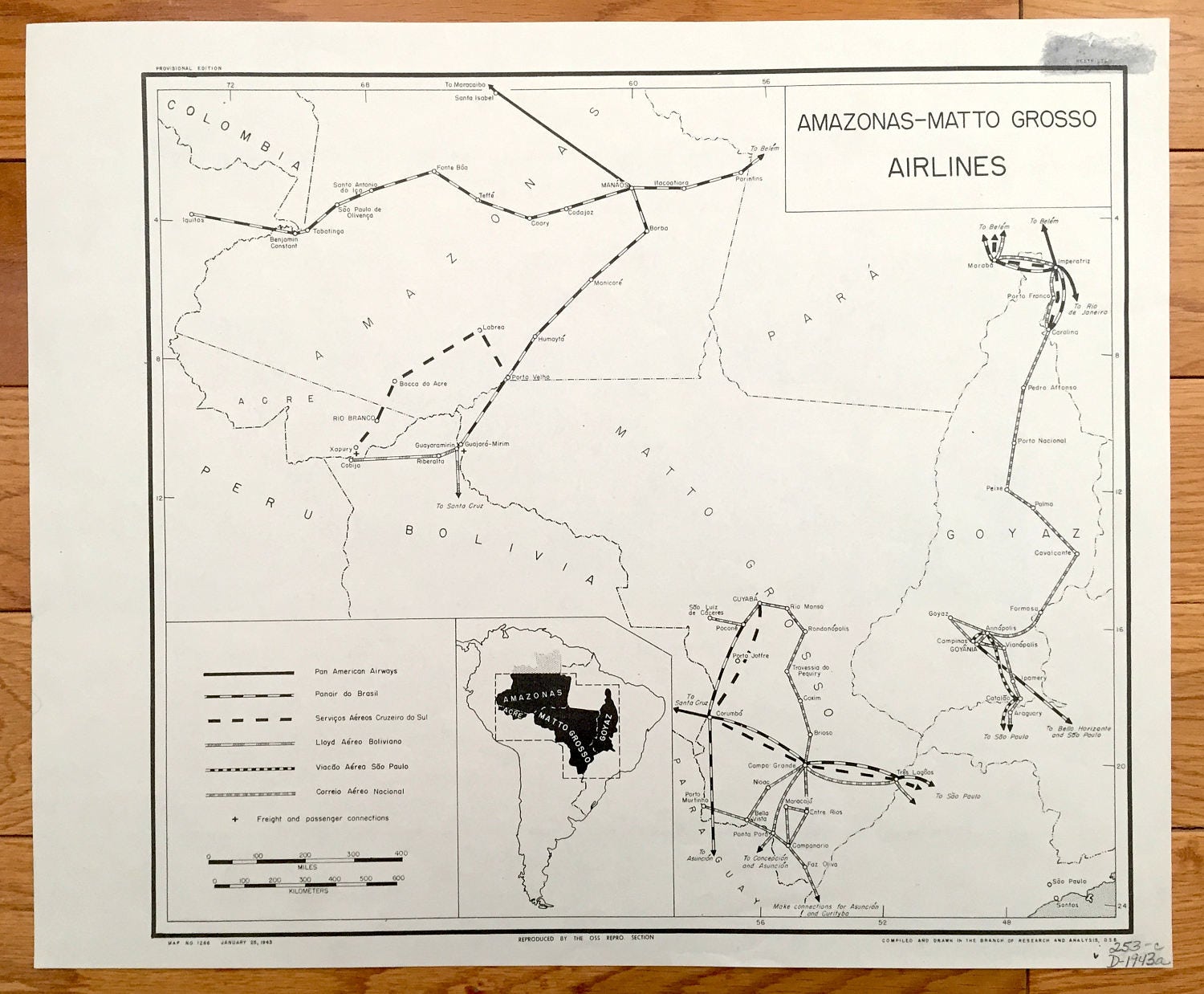Antique Amazonas-Matto Grosso Region Airline Map 1943 – Formerly Restricted US Government – Goyaz, São Paulo, Paraguay, Pará, South America