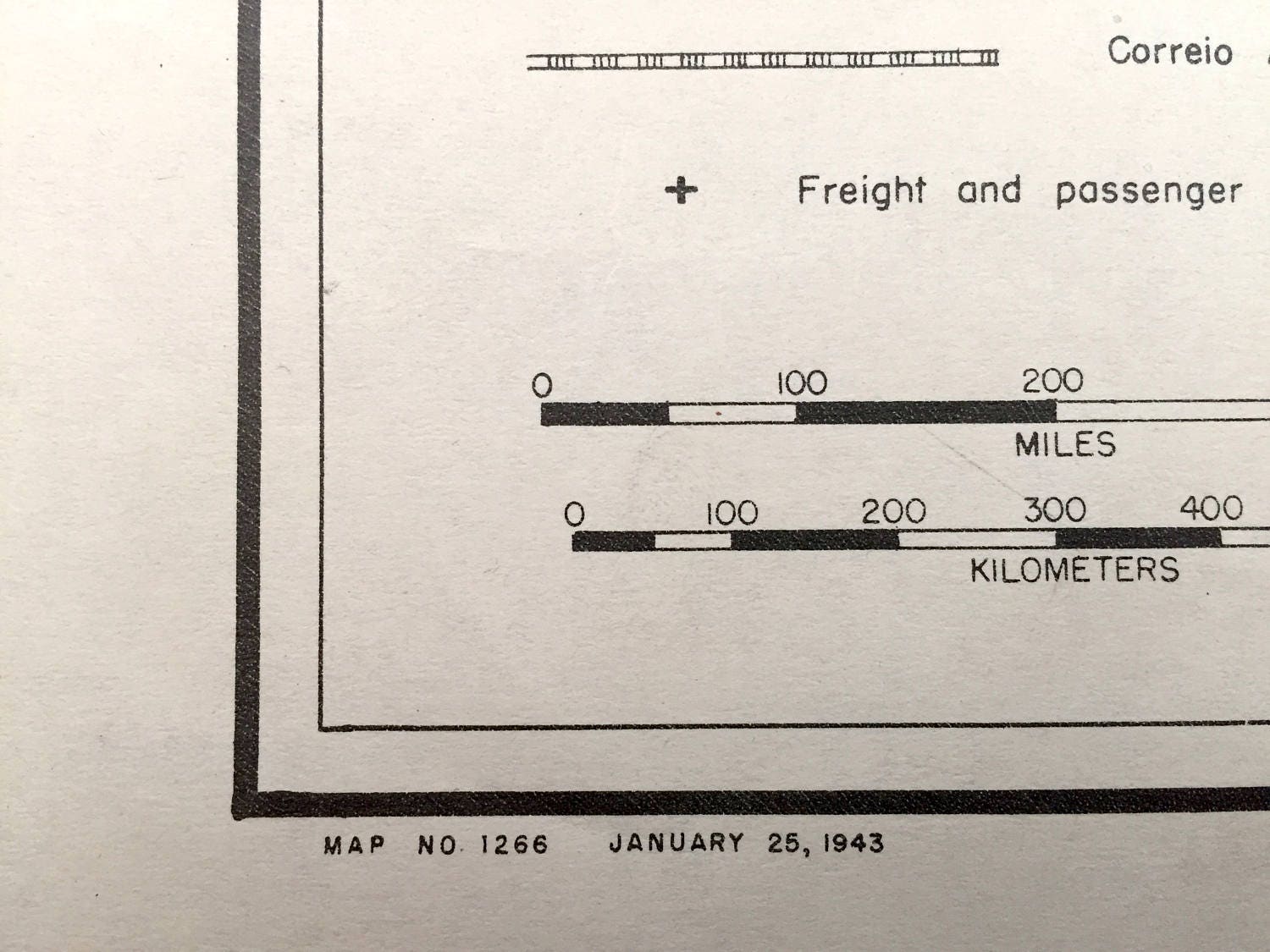 Beautiful, antique map of the Airline Routes of Amazonas-Matto Grosso Region from 1943. In the top right the word "restricted" has been inked out, possibly when the info was declassified—but over time this ink has evaporated from the paper, revealing the word underneath.