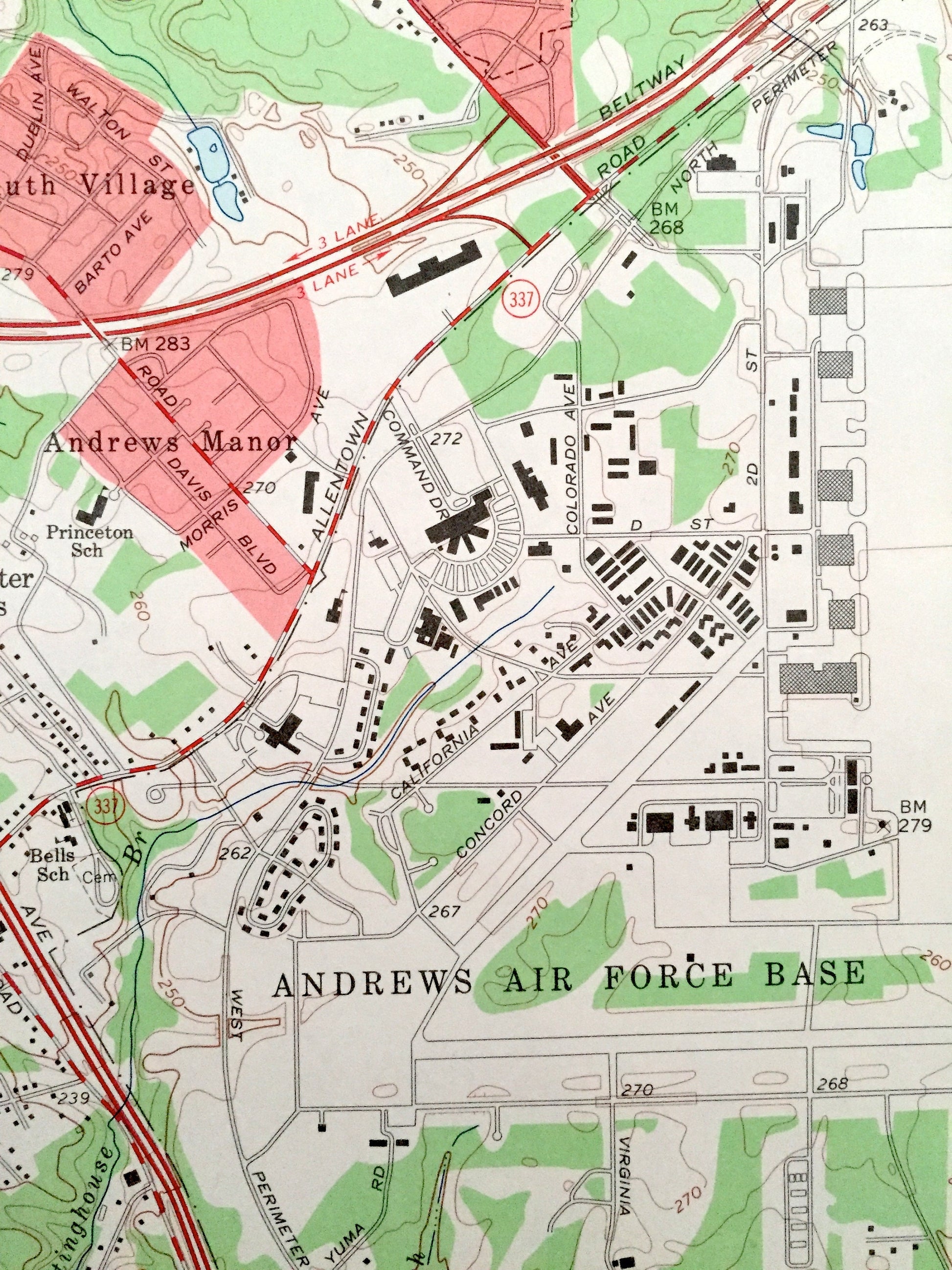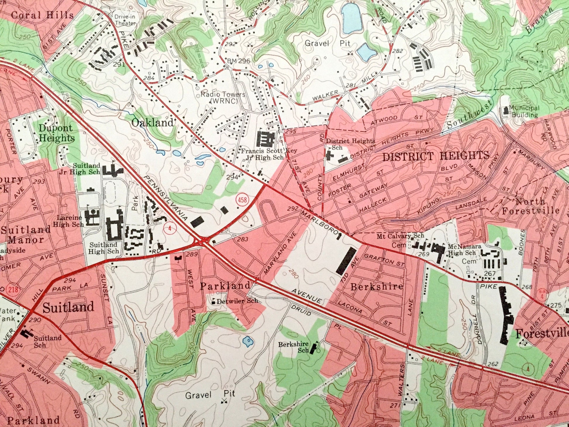 Points of Interest: Anacostia River, Baltimore and Ohio Railroad, Fort Stanton Park, Henson Creek, Rosecroft Raceway, Andrews Air Force Base, Stanton Reservoir, Fort Dupont Park, and many more hills, streams, ponds, houses, schools, churches and roads.
