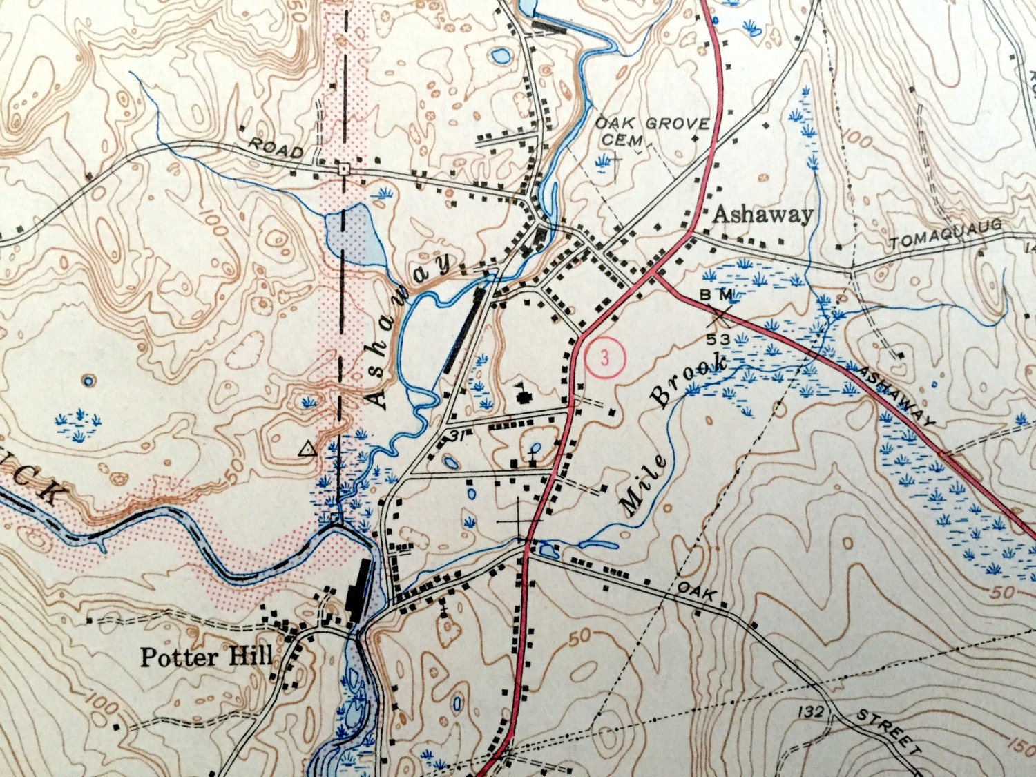 Points of Interest: Chapman Hill, Wyassup Lake, Spalding Pond, Chapman Pond, Ward high School, Mount Moriah, Wood Hill Reservation, Maxon Hill, Pitcher Mountain, Spaulding Pond, New York New Haven and Hartford Railroad and lots more hills, mountains, creeks, towns, and roads.