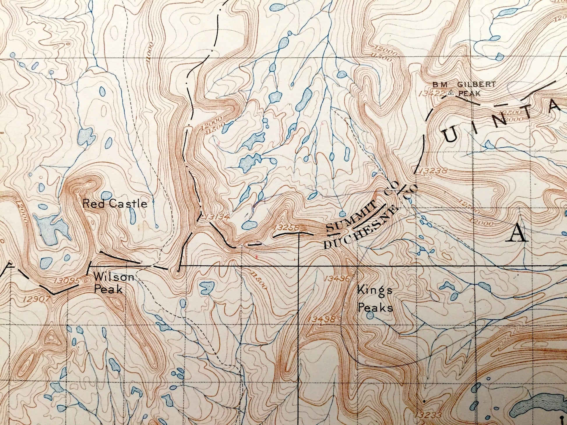Points of Interest: Wasatch National Forest, Ashley National Forest, Uinta Mountains, Summit County, Duchesne County, Red Castle, Gilbert Peak, Kings Peak, Mt Emmons, Wilson Peak, Gilbert Meadows, Beaver Creek, Lake Atwood, Uinta River, North Burro Peak, Island Lake, a sliver of Wyoming and lots more creeks, mountains, ranges, lakes, houses and roads.