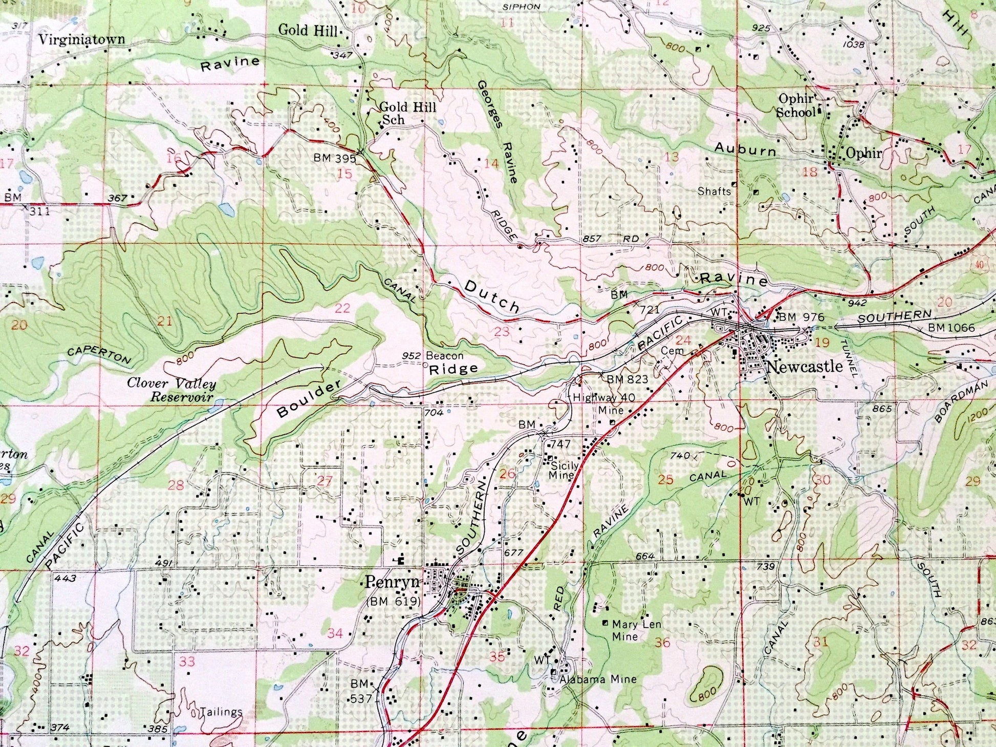 Points of Interest: Placer County, El Dorado County, American River, Rock Creek Lake, Folsom Reservoir, Dewitt State Hospital, Clover Valley, Dutch Ravine, Cooper Canyon, Flagstaff Hill, Miners Ravine, Boulder Ridge, Big Hill, Christian Valley, Bald Hill, Secret Ravine, and many more hills, streams, ponds, houses, schools, churches and roads.