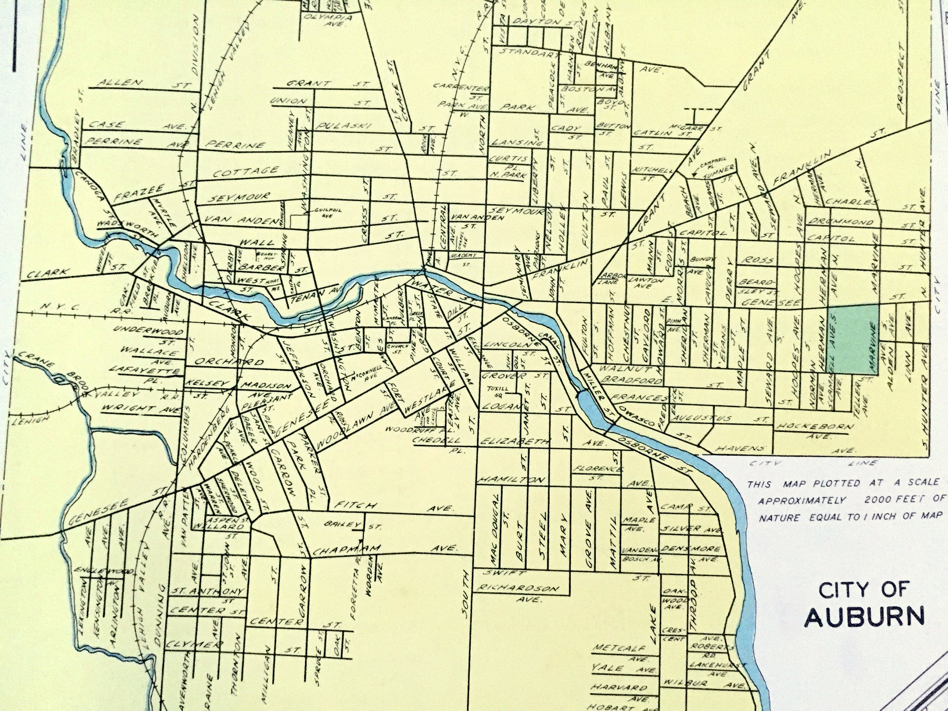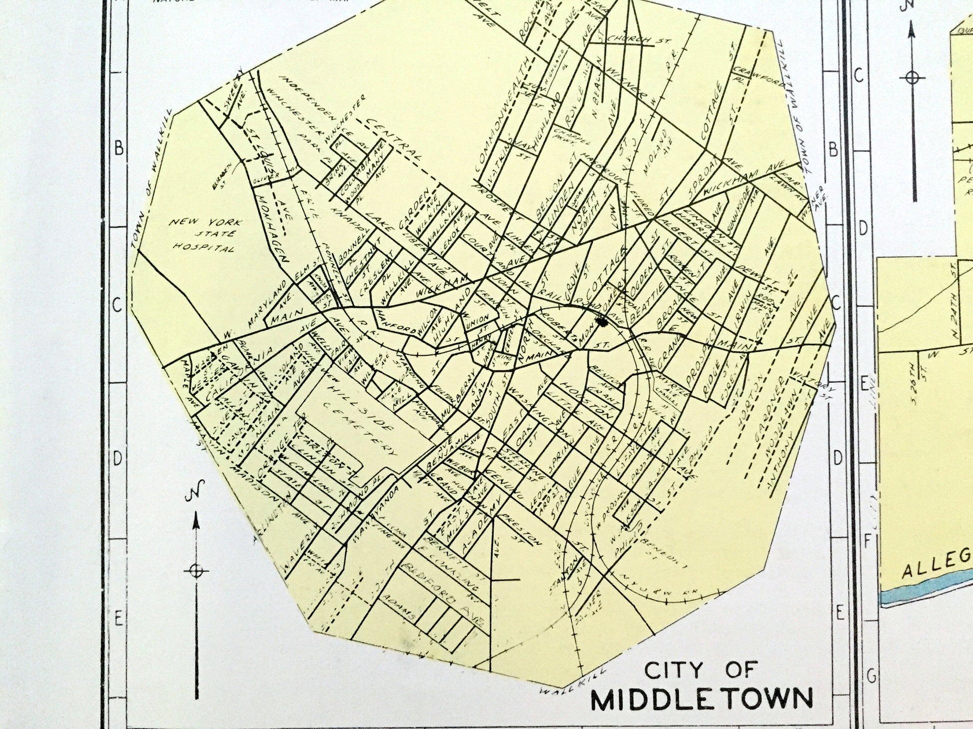 Beautiful, antique street map of the cities of Auburn, Glens Falls, Middletown, Olean & Canandaigua, New York. This is an authentic print taken from the rare "Historical Atlas of New York State" by William P. Munger, published by Frank E. Richards Co. in 1941, and is NOT a computer reproduction.