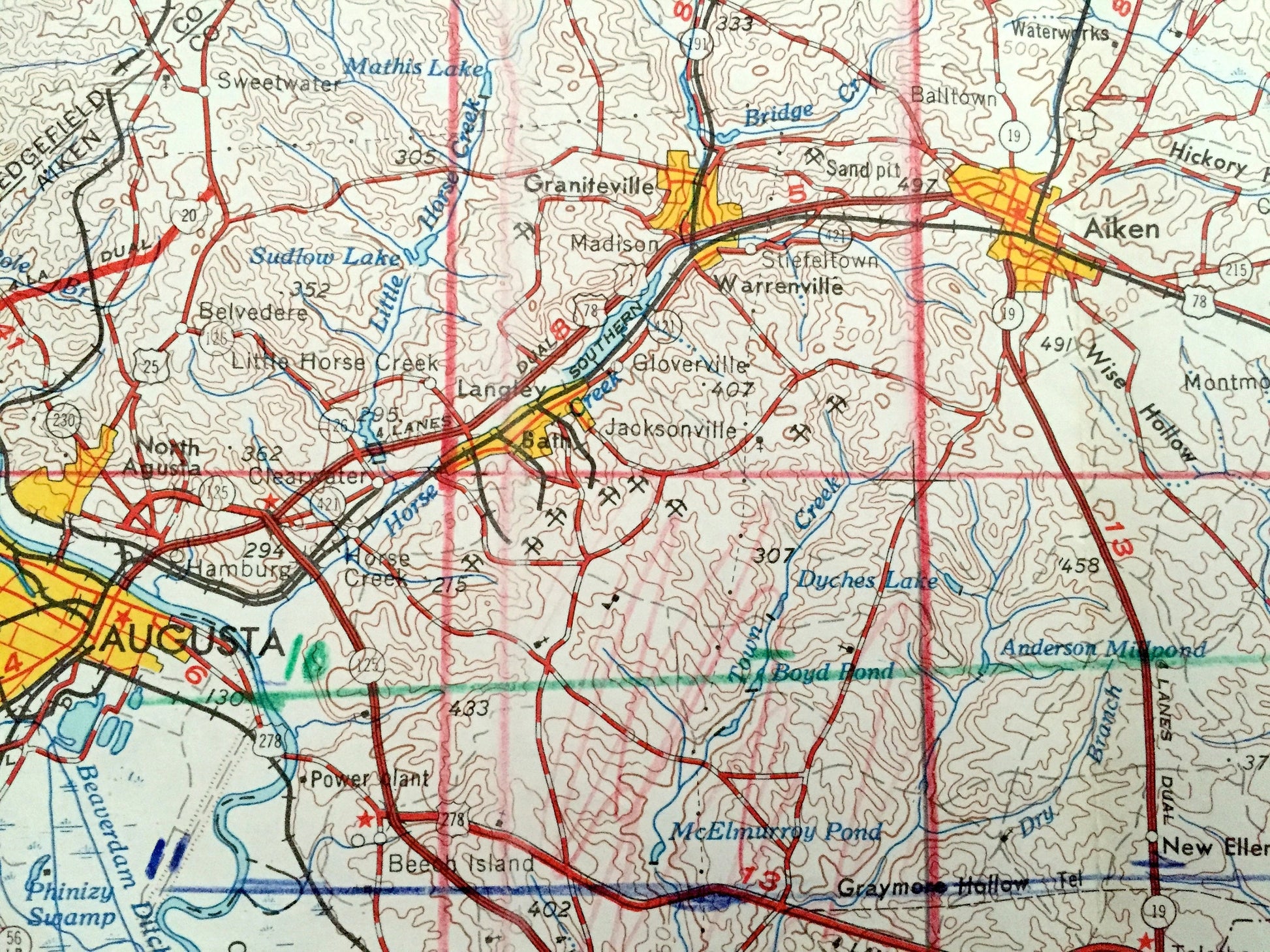 Antique Augusta, Georgia 1957 US Geological Survey Topographic Map – South Carolina, Aiken, Graniteville, Warrenville, Bath, North Augusta