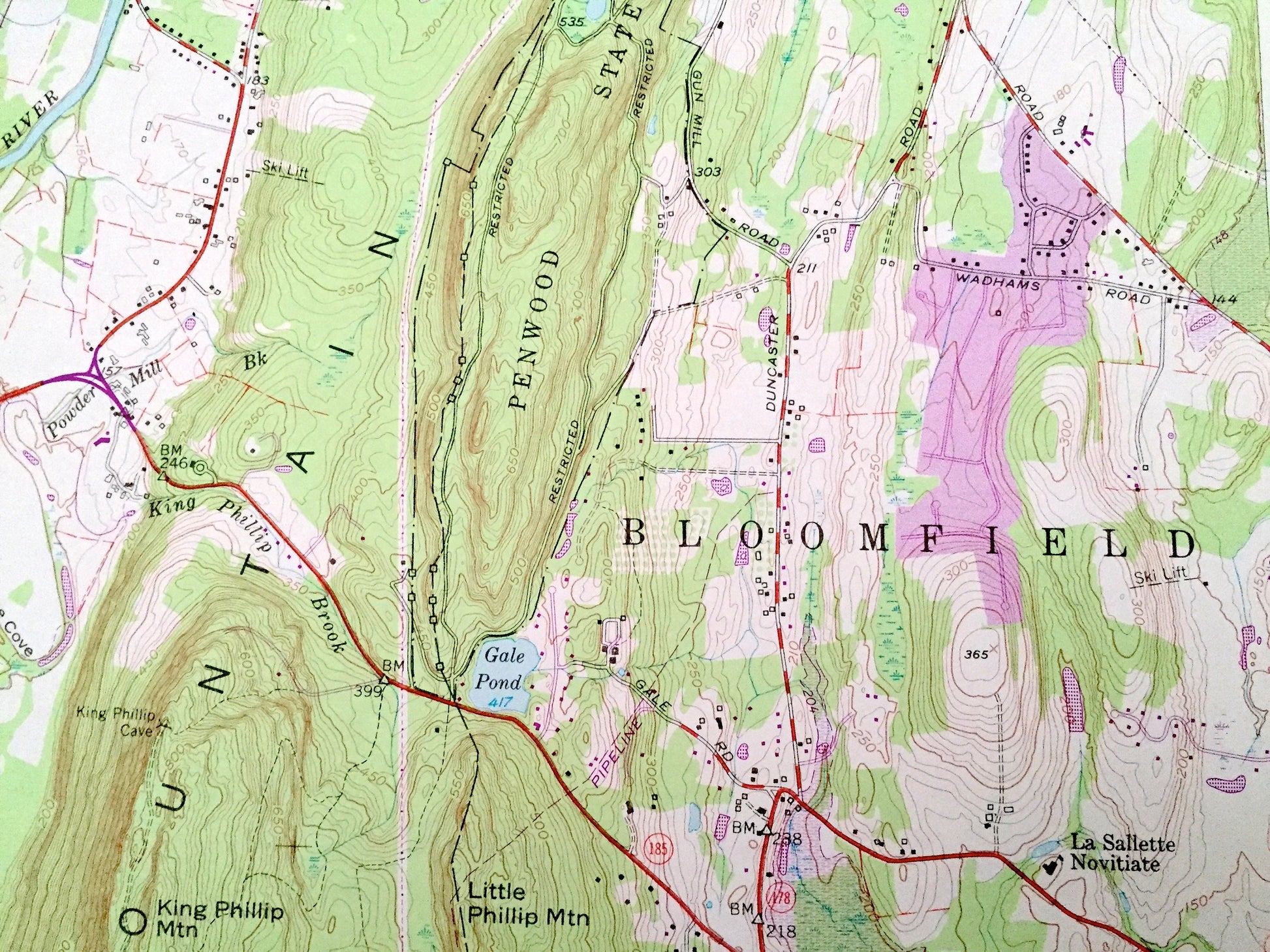 Points of Interest: Massacoe State Forest, Stratton Brook State Park, Penwood State Park, MacDonald Memorial Park, La Sallette Novitiate, Talbot Mountain, Kilkenny Rocks, Onion Mountain, The Sugarloaf, Bushy Hill, The Pinnacle, King Phillip Mountain, Little Phillip Mountain, Grant Hill, Hartford Reservoirs, Gale Pond, Stub Pond, Lily Pond, Farmington River, Griffin Brook, Nod Brook, Thompson Brook, Stratton Brook, and many more hills, streams, ponds, houses, schools, railroads, churches and roads.