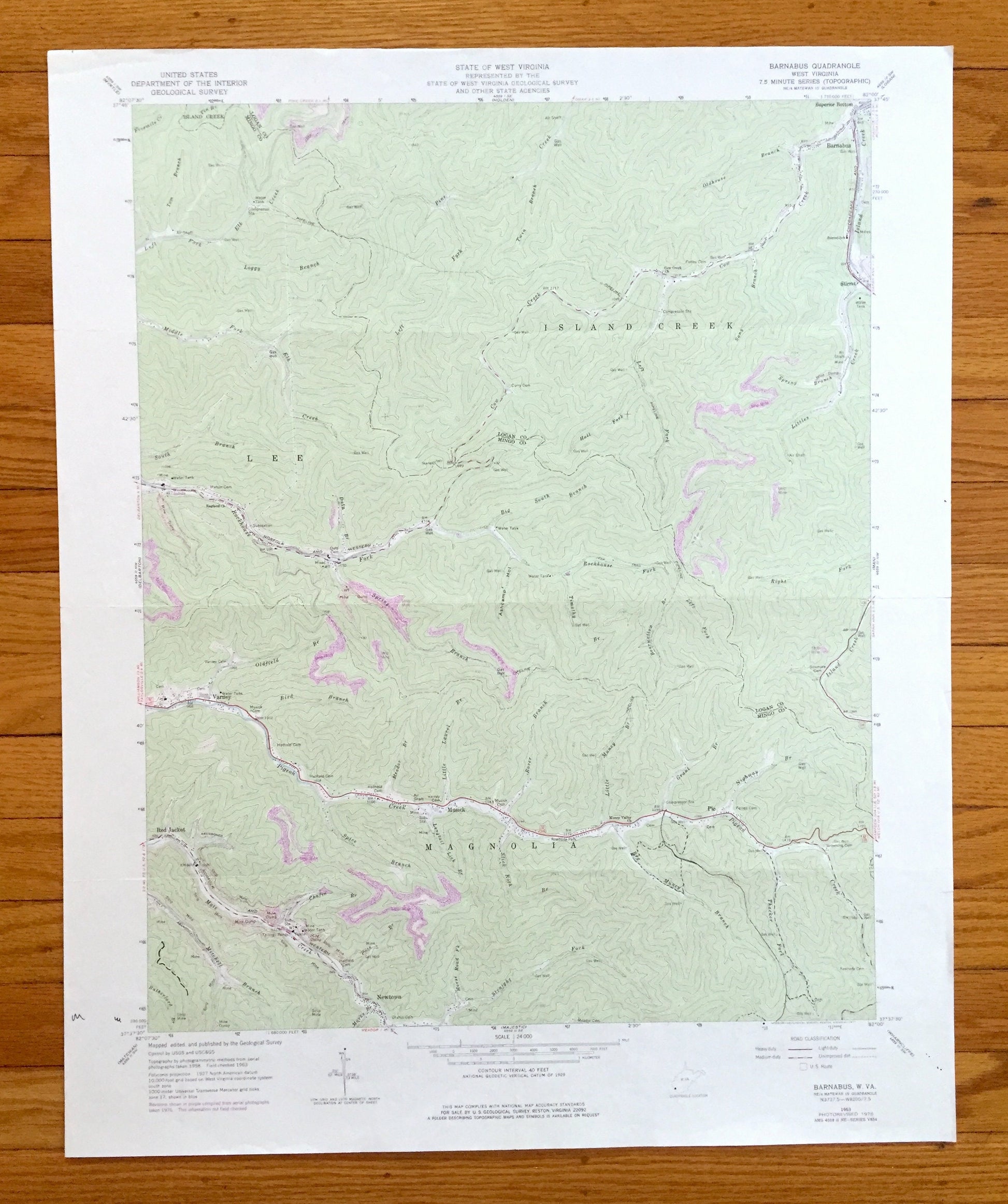 Beautiful, antique map of Barnabus, West Virginia and surrounding Logan County and Mingo County areas. This is an authentic 1963 edition, 1977 print from the U.S. Geological Survey and NOT a computer reproduction.