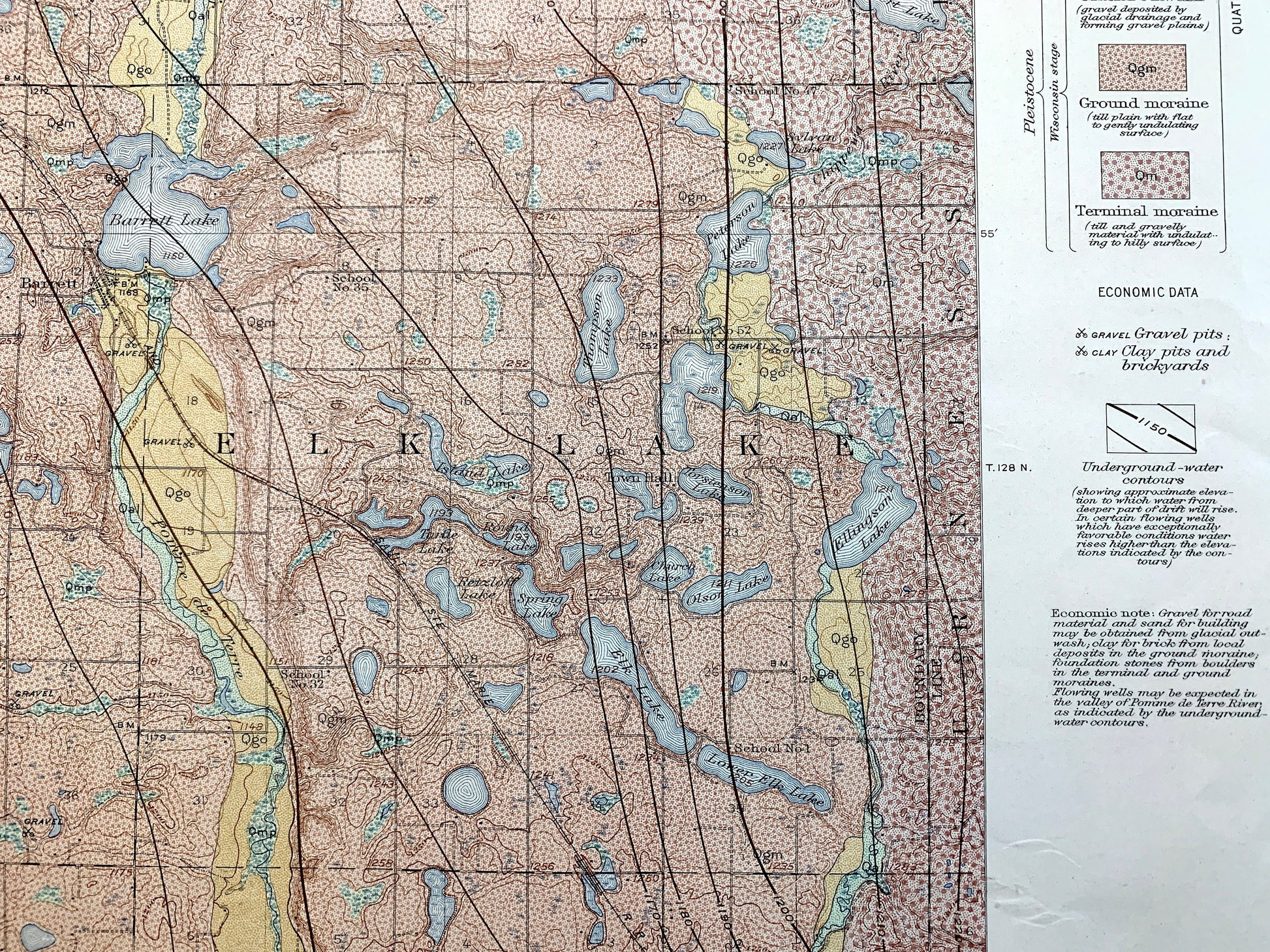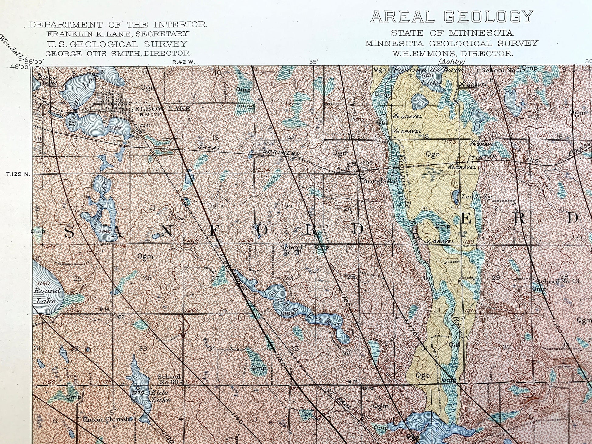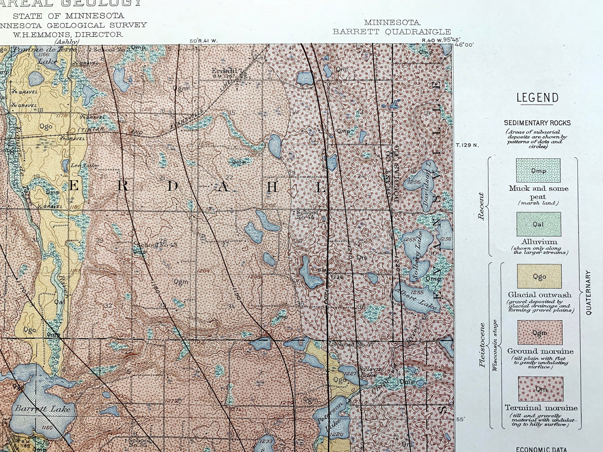 Beautiful, antique Areal Geology map of Barrett, Minnesota and surrounding Grant County, Douglas County, Pope County, Stevens County areas. This is an authentic 1912 edition, 1917 print from the U.S. Geological Survey and NOT a computer reproduction. It is from a Geologic Atlas folio.
