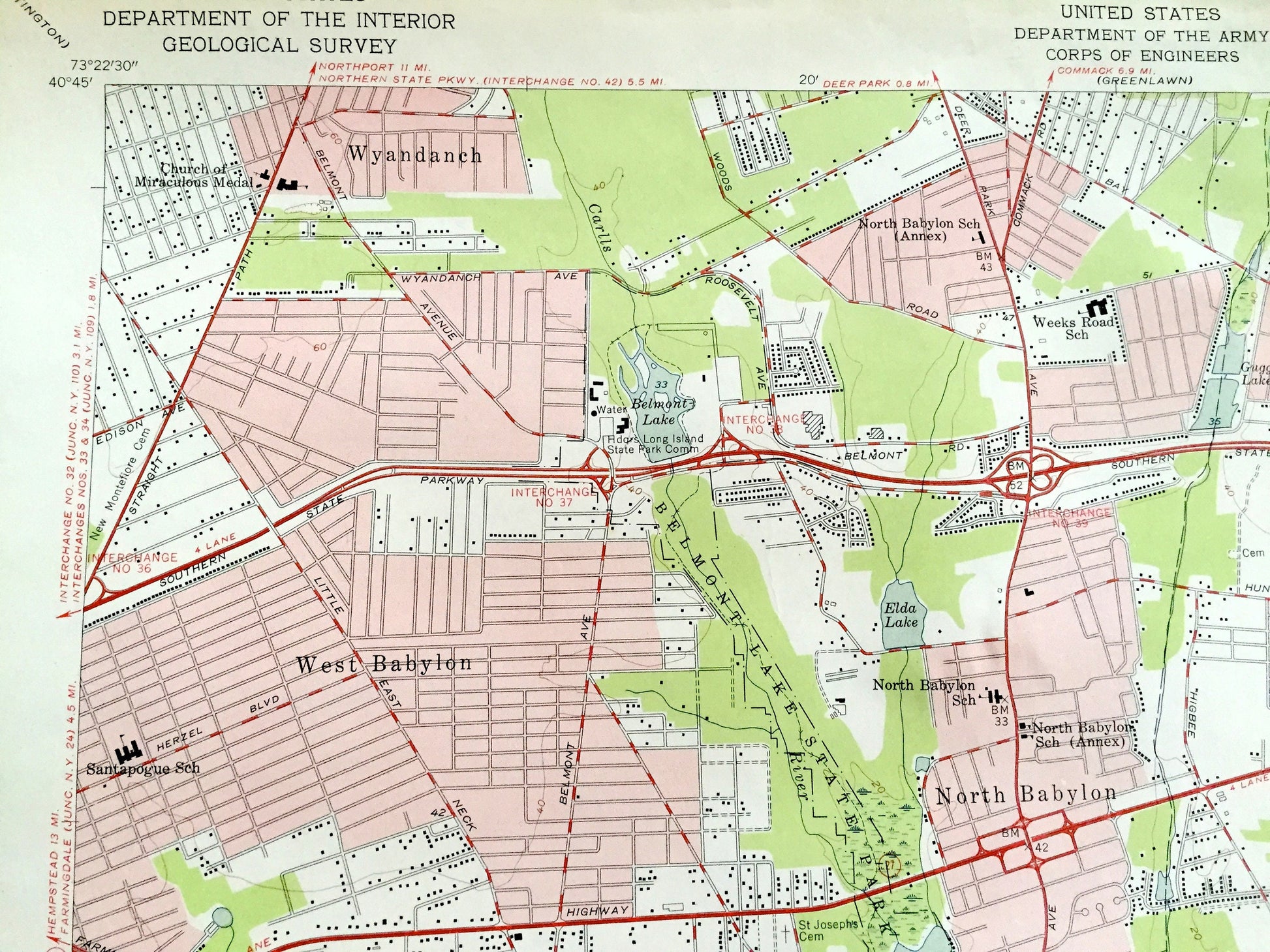 Points of Interest: Suffolk County, Great South Bay, Fire Island, Fire Island State Park, Cedar Island, Captree Island, Captree State Park, Gilgo State Park, Cedar Island, Oak Island, Seganic Island, Democrat Point, Great South Beach, Belmont Lake State Park, Southards Pond, Memorial Pond, Babylon Beach, Santapogue Neck, Great East Neck, Carlls River, Sampawams Neck, Great Cove, Okenok Neck, Sequatogue Neck, Appletree Neck, Fire Island Inlet, and many more beaches, islands, creeks, ponds, schools, houses, and roads.