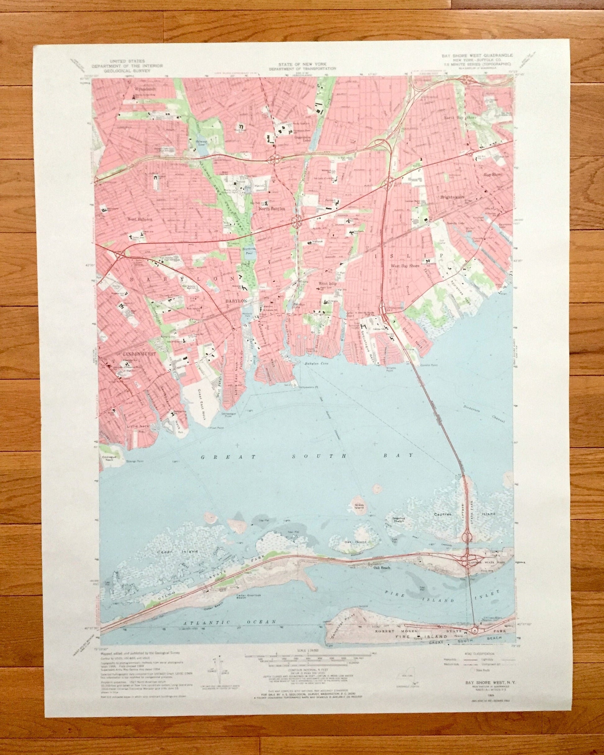 Antique Bay Shore West, New York 1969 US Geological Survey Topographic Map – Fire Island, Suffolk County, Long Island, Islip, Babylon, NY