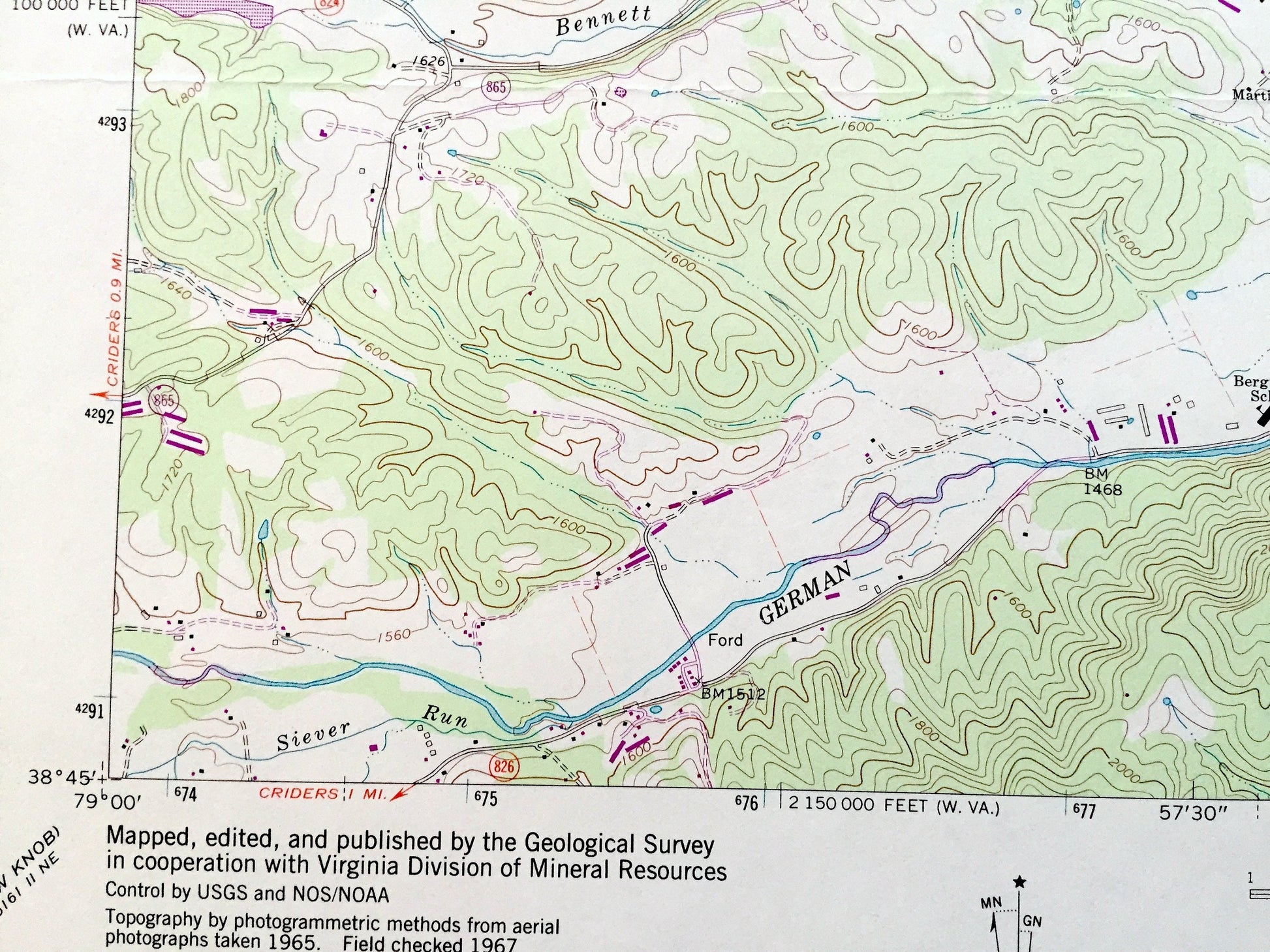 Beautiful, antique map of Bergton, Virginia and surrounding Rockingham County areas, including West Virginia’s Hardy County. This is an authentic 1967 edition, 1987 print from the U.S. Geological Survey and NOT a computer reproduction.