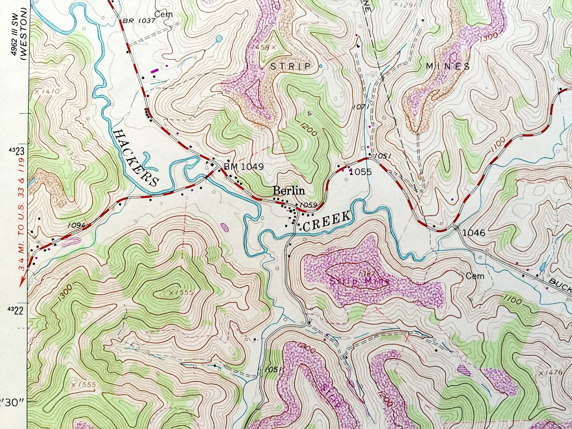 Beautiful, antique map of Berlin, West Virginia and surrounding Harrison County, Lewis County & Upshur County areas. This is an authentic 1961 edition, 1977 print from the U.S. Geological Survey and NOT a computer reproduction.