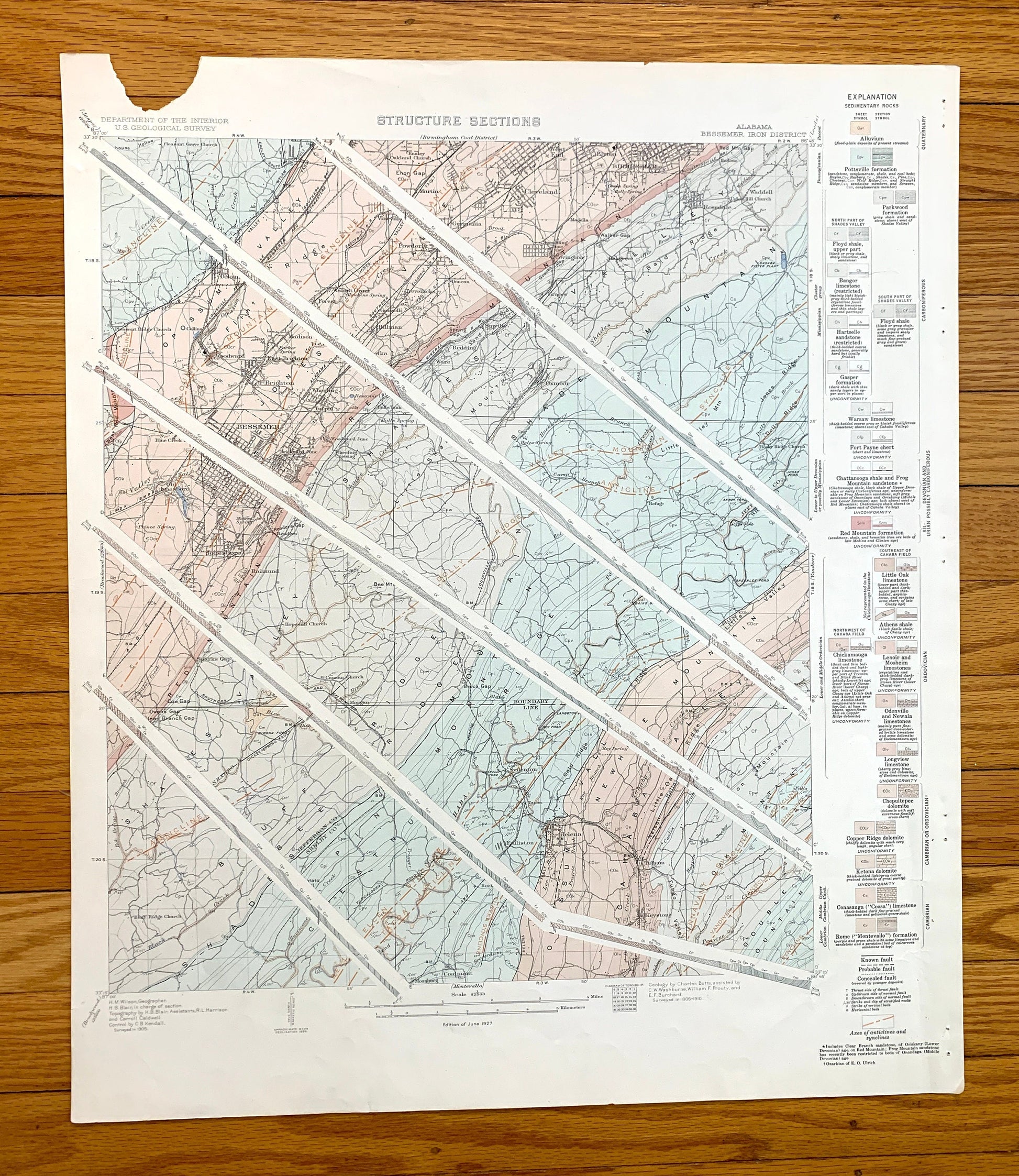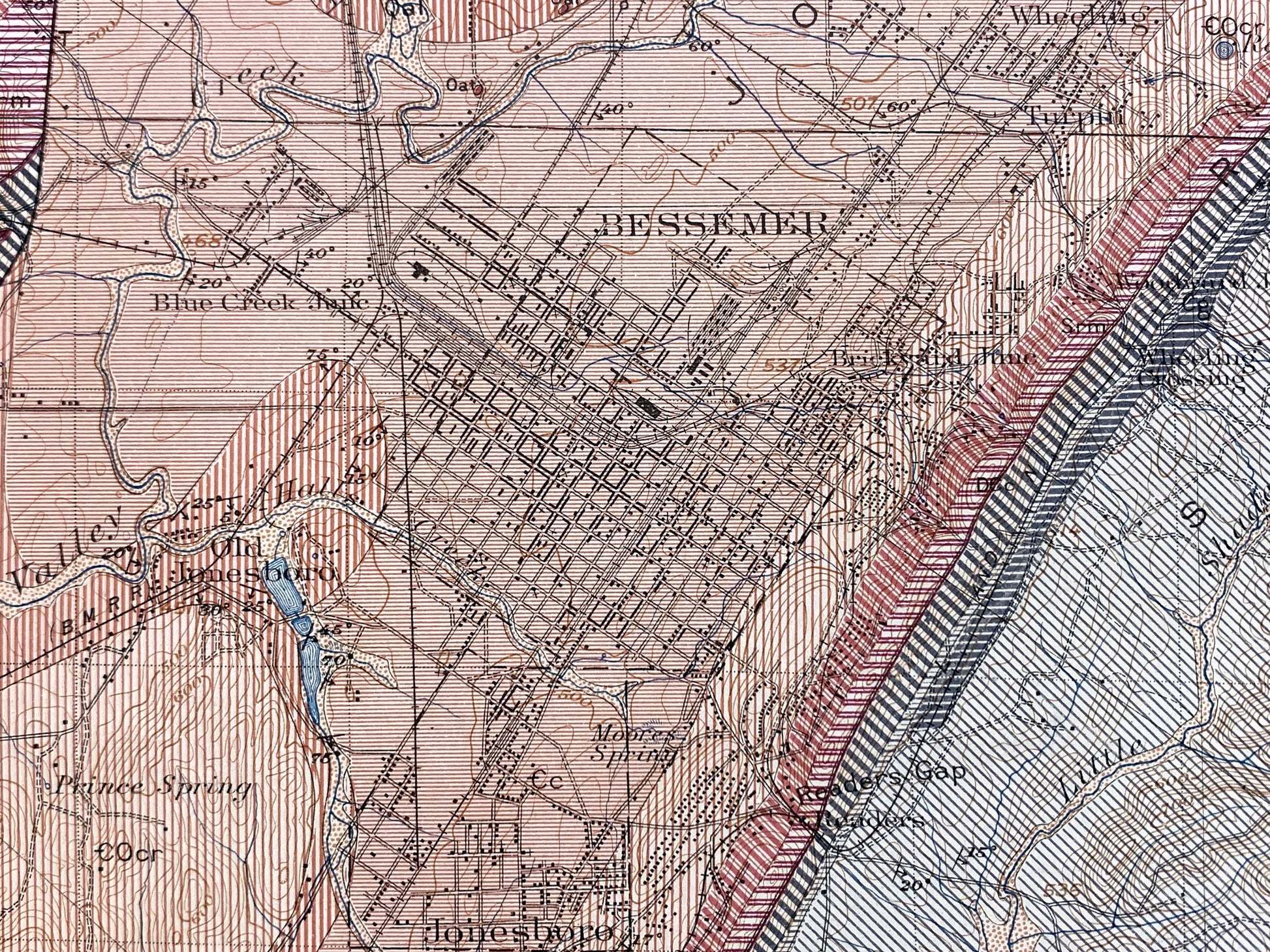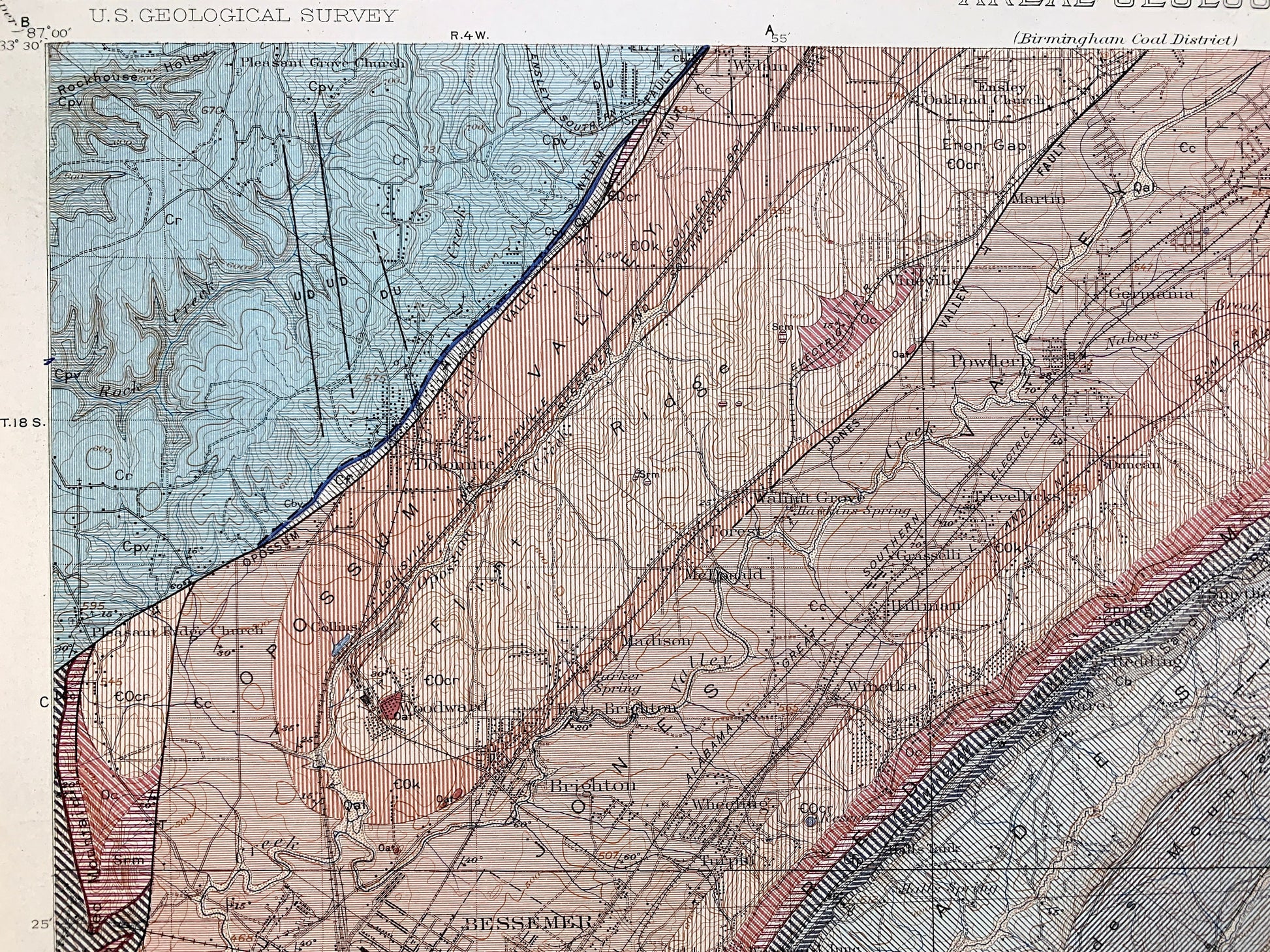 Beautiful, antique Structure Sections map of Bessemer, Alabama and surrounding Jefferson County and Shelby County areas. This is an authentic 1927 edition, 1927 print from the U.S. Geological Survey and is NOT a computer reproduction. It is from a Geologic Atlas folio.